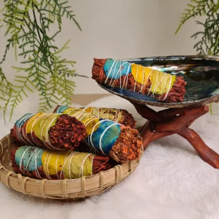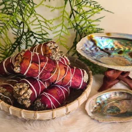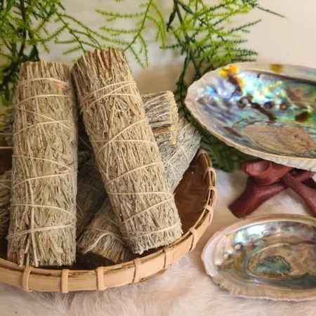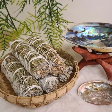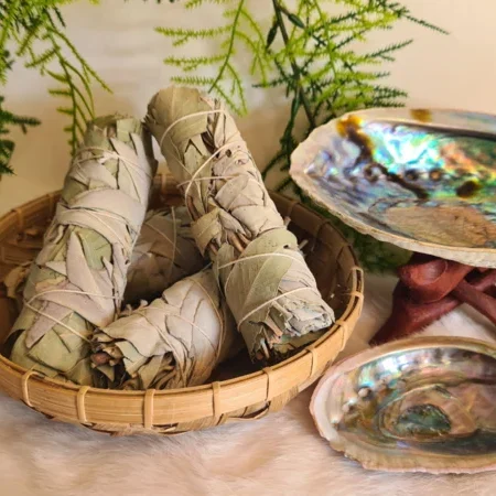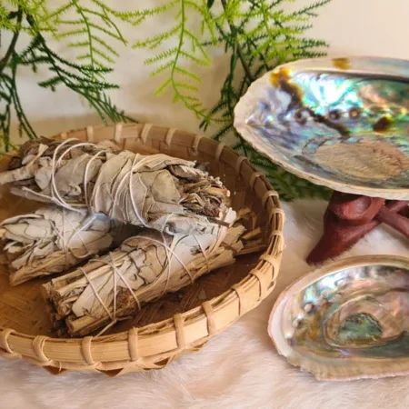 Veiligheidadvies bij gebruik van smudge sticks: zorg voor een vuurvaste schaal of een abaloneschelp en een zakje zand. Steek het uiteinde van de bundel aan en wapper er even mee zodat het vlammetje dooft en de bundel blijft smeulen.