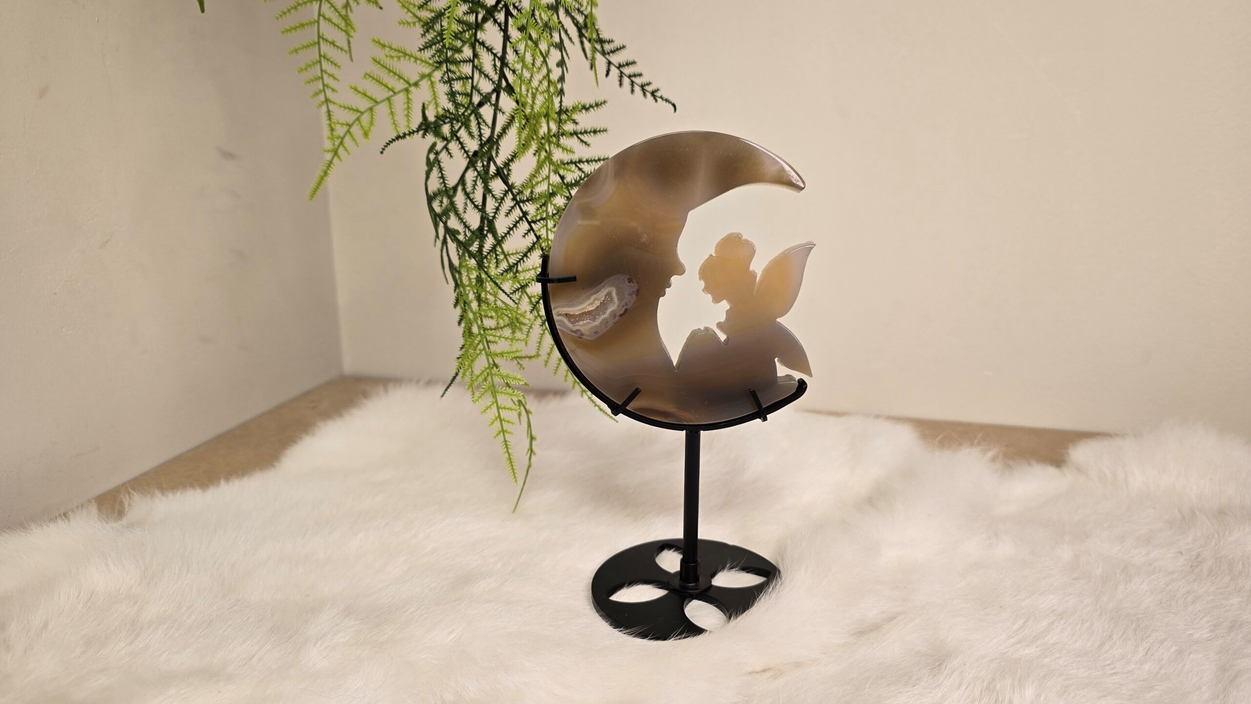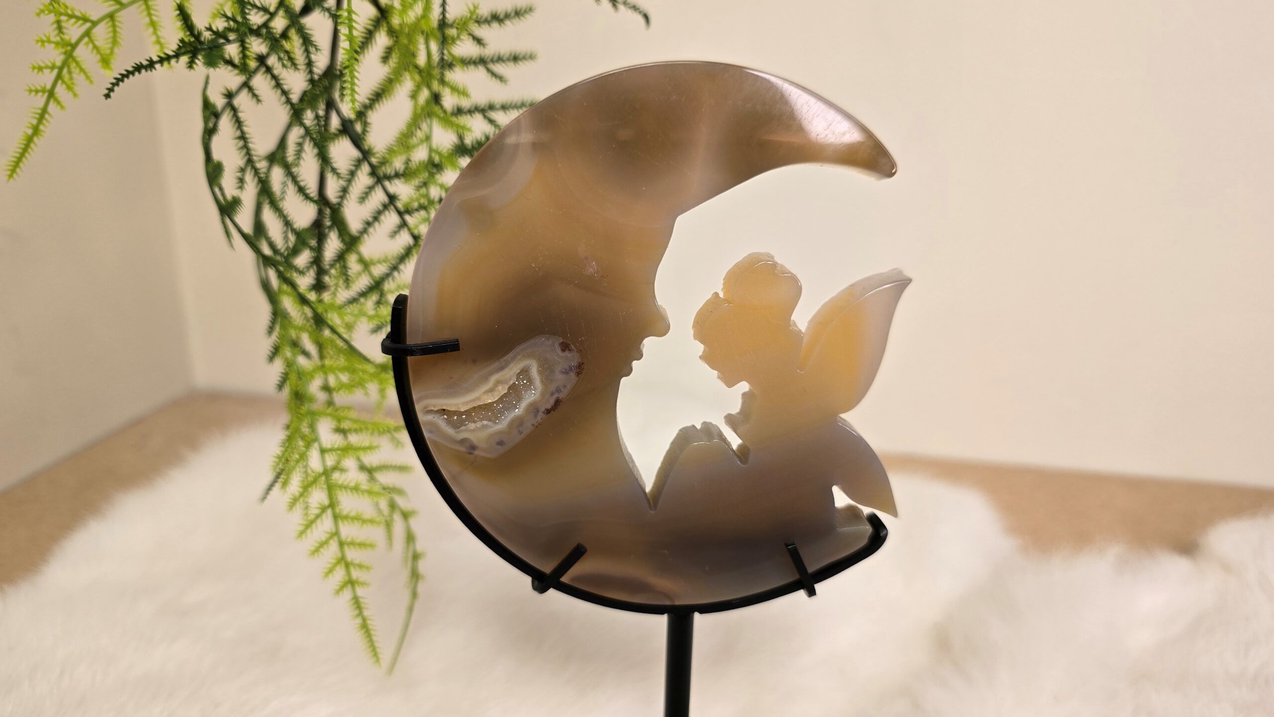 Prachtige Engel op maan carving in Agaat los in een metalen standaard, met schitterende kristallen.