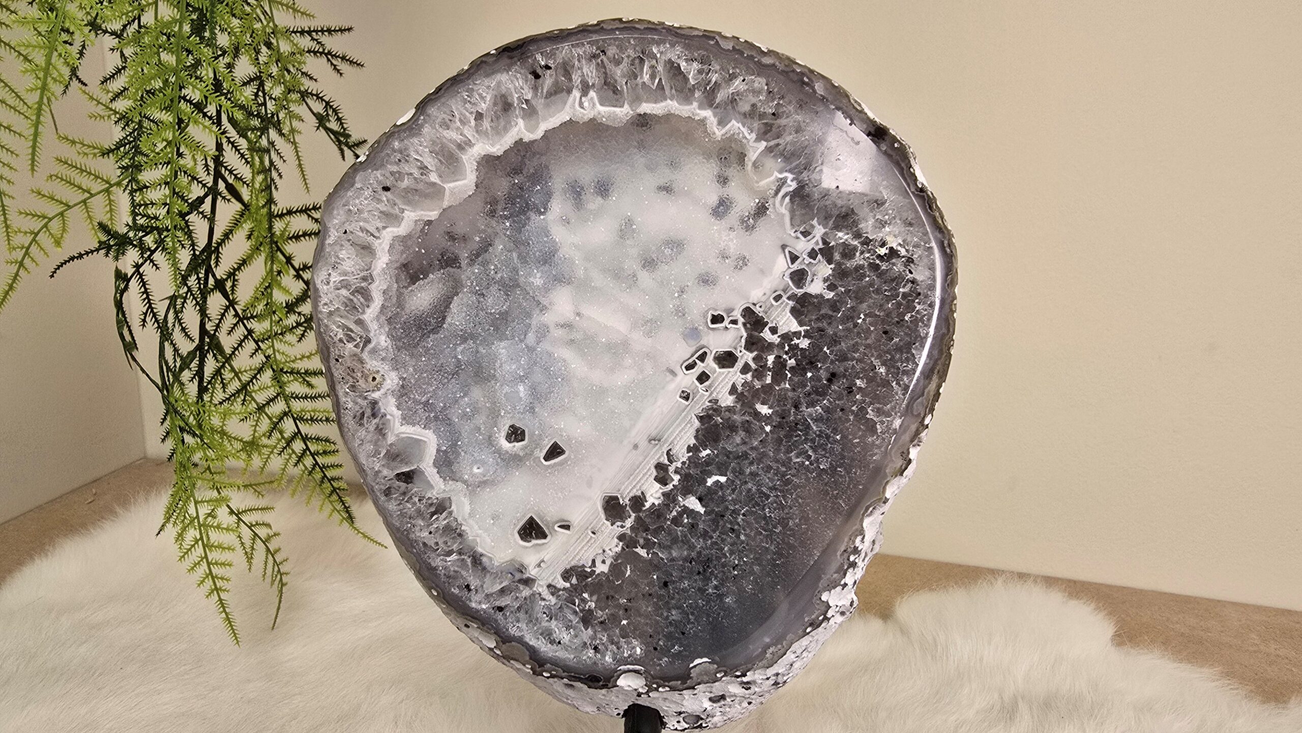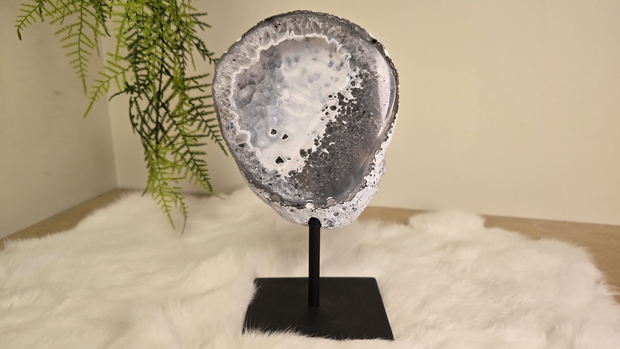 Prachtige agaat op een metalen standaard, met inde kern schitterende kristallen. Agaat is een zachte, aardende steen met een geruststellende en kalmerende energie.