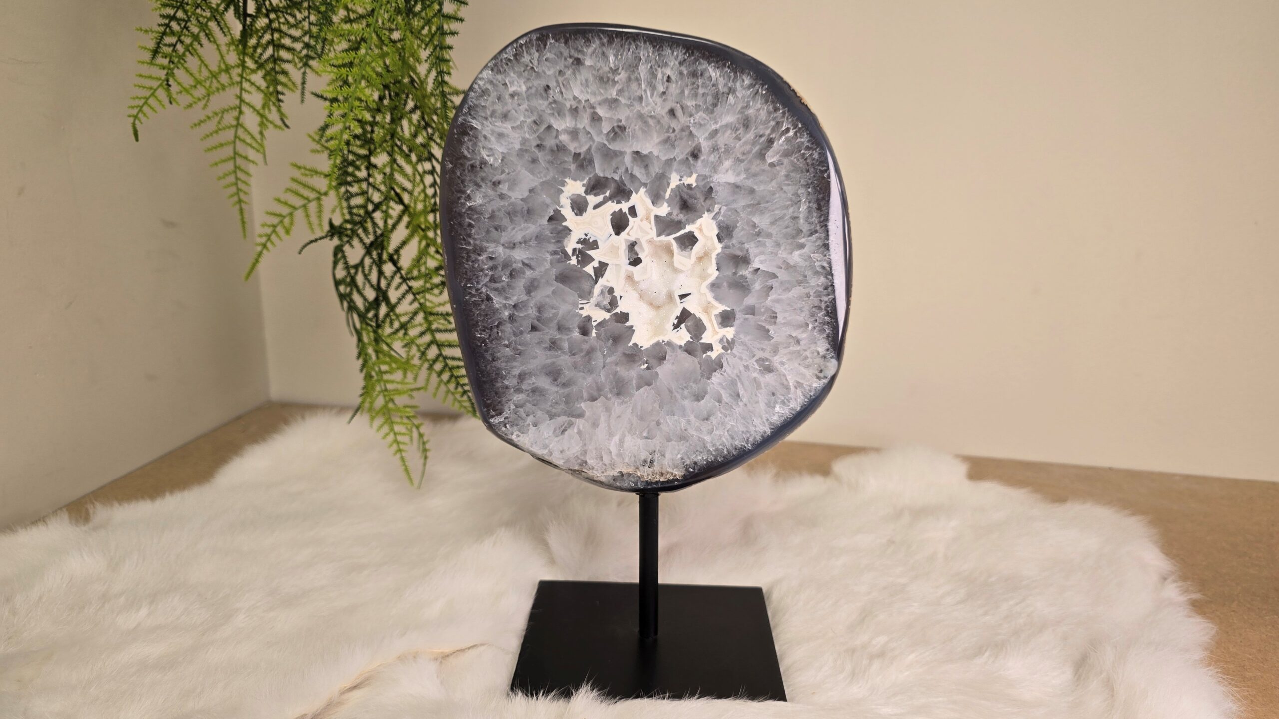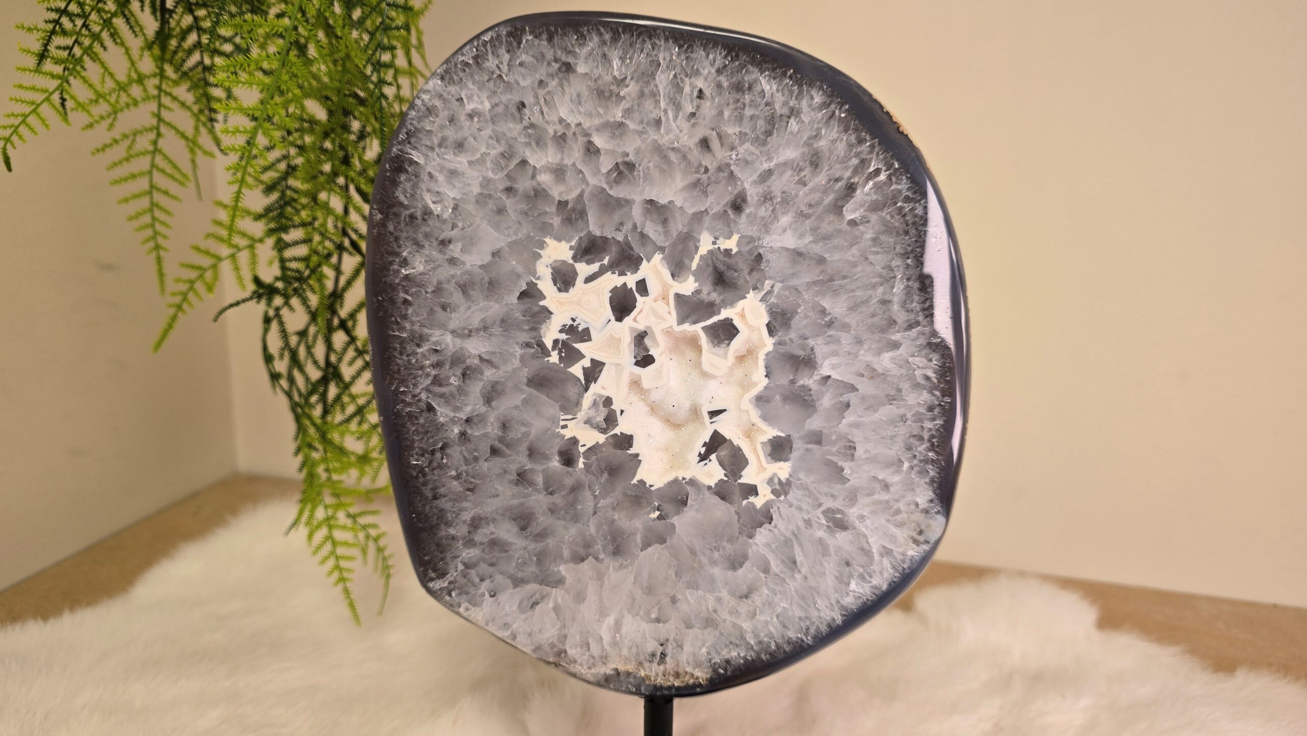 Prachtige Agaat op een metalen standaard, met in de kern schitterende kristallen.