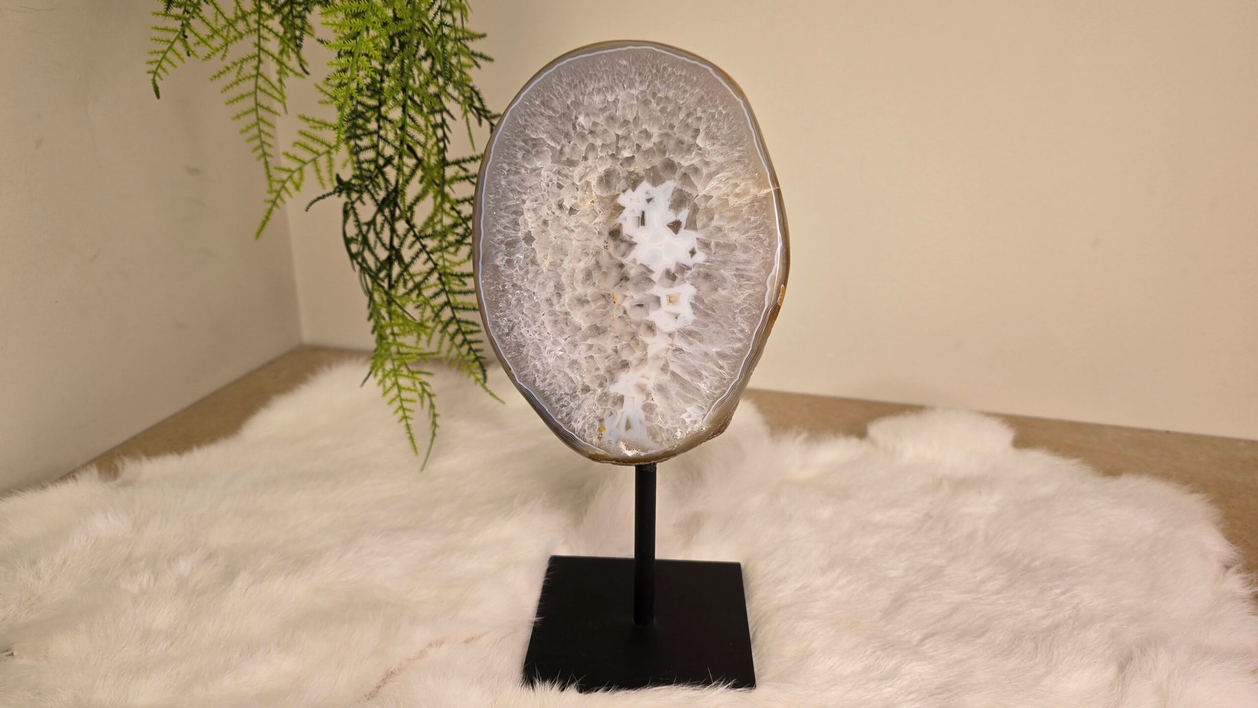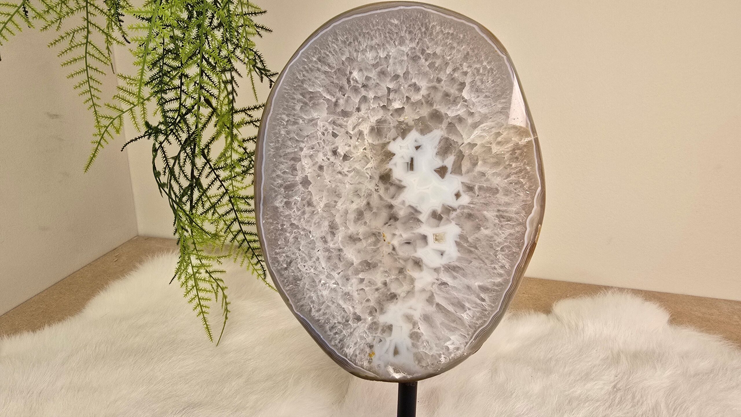 Prachtige Agaat op een metalen standaard, vlak gepolijst.