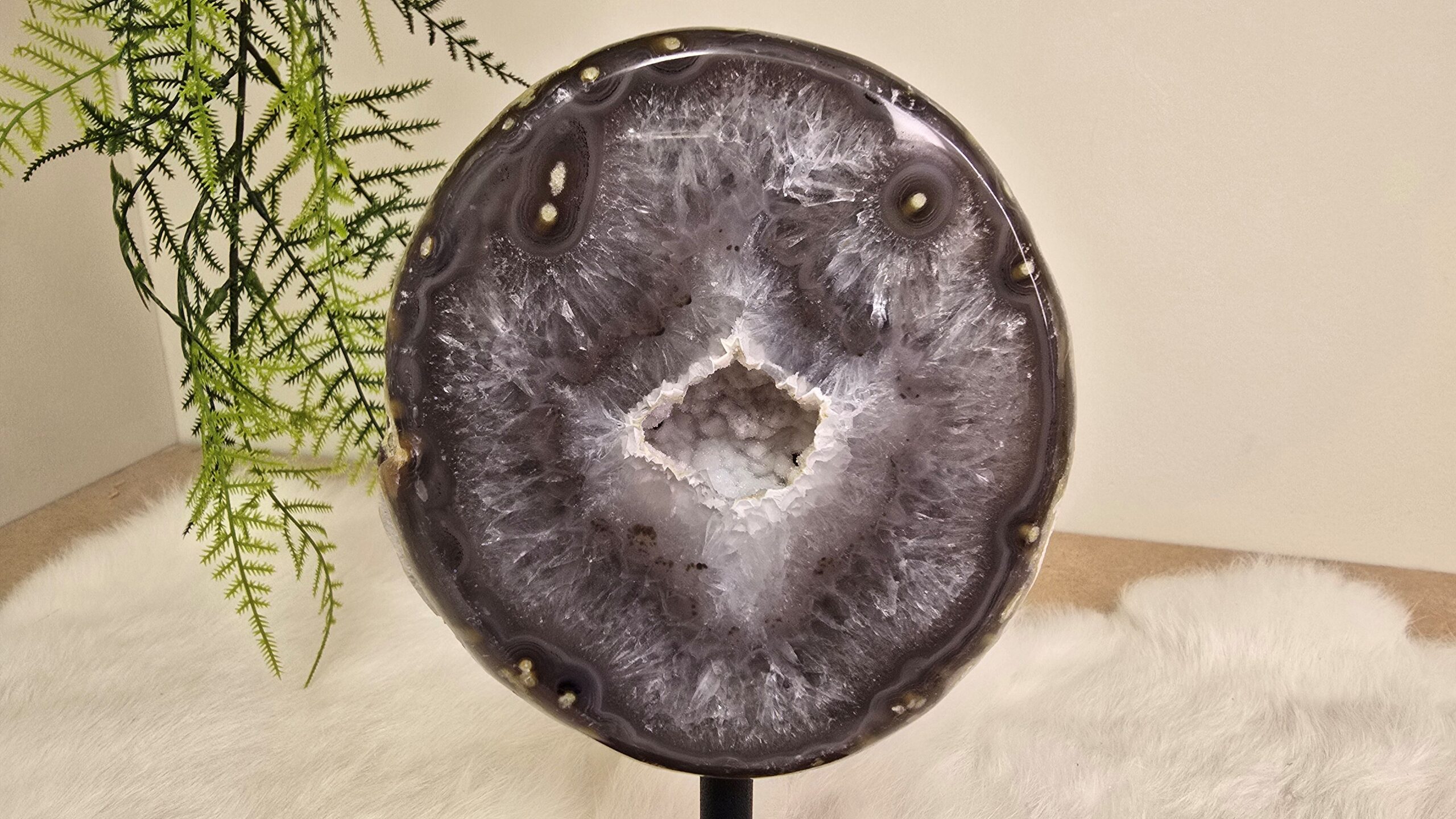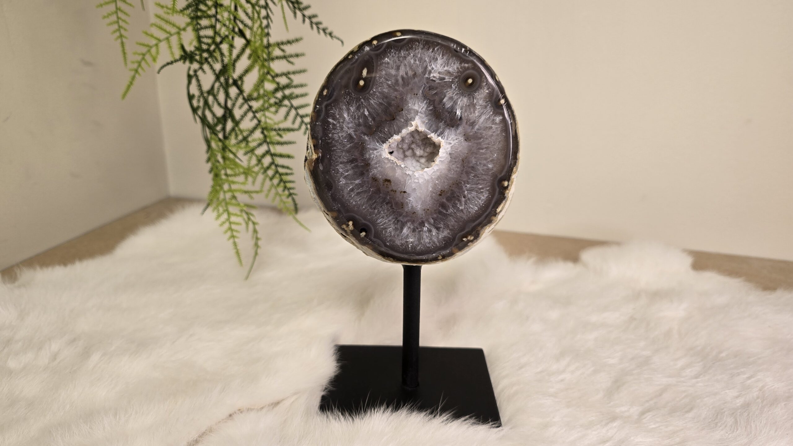 Prachtige agaat op een metalen standaard, met inde kern schitterende kristallen. Agaat is een zachte, aardende steen met een geruststellende en kalmerende energie.