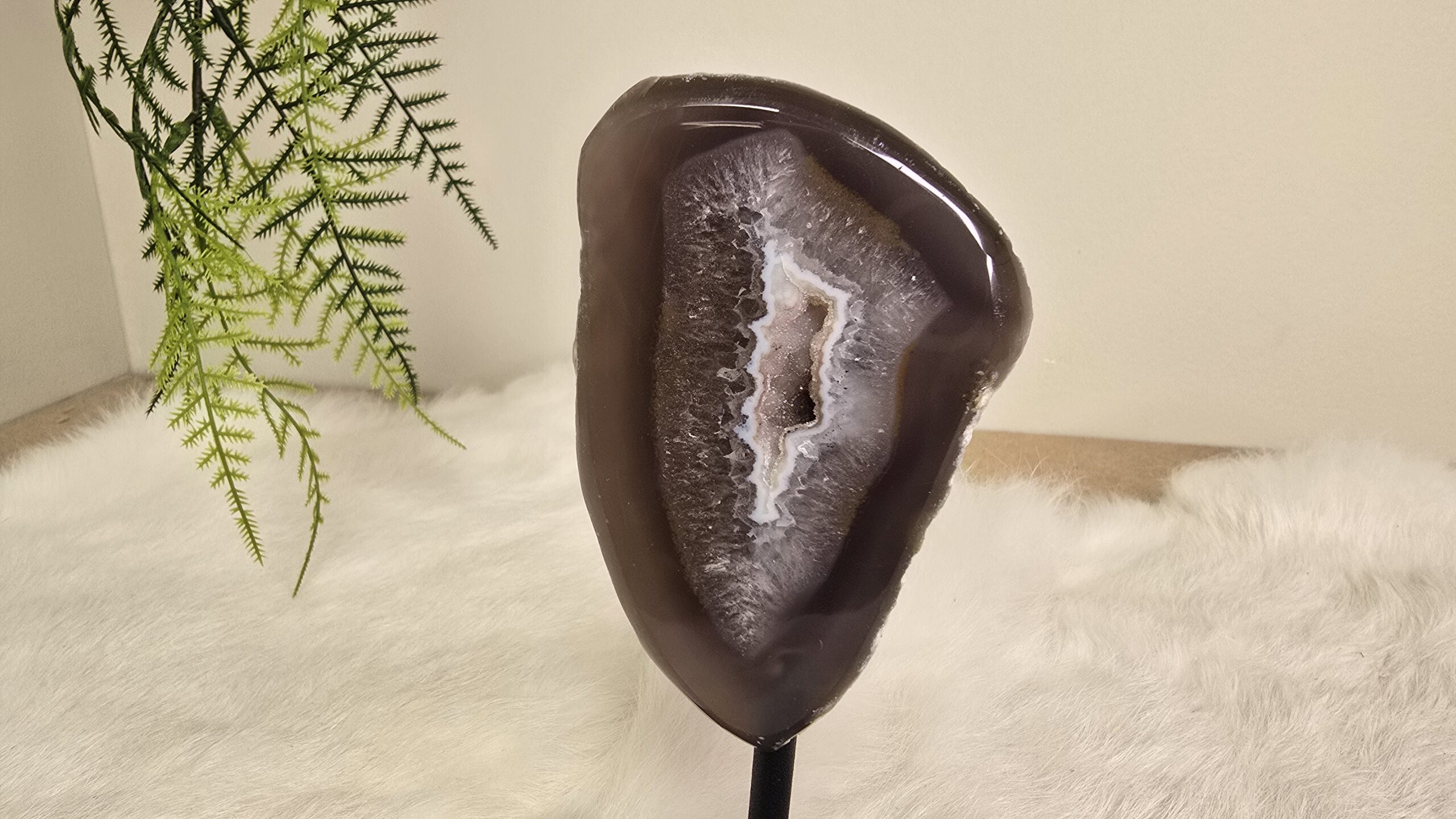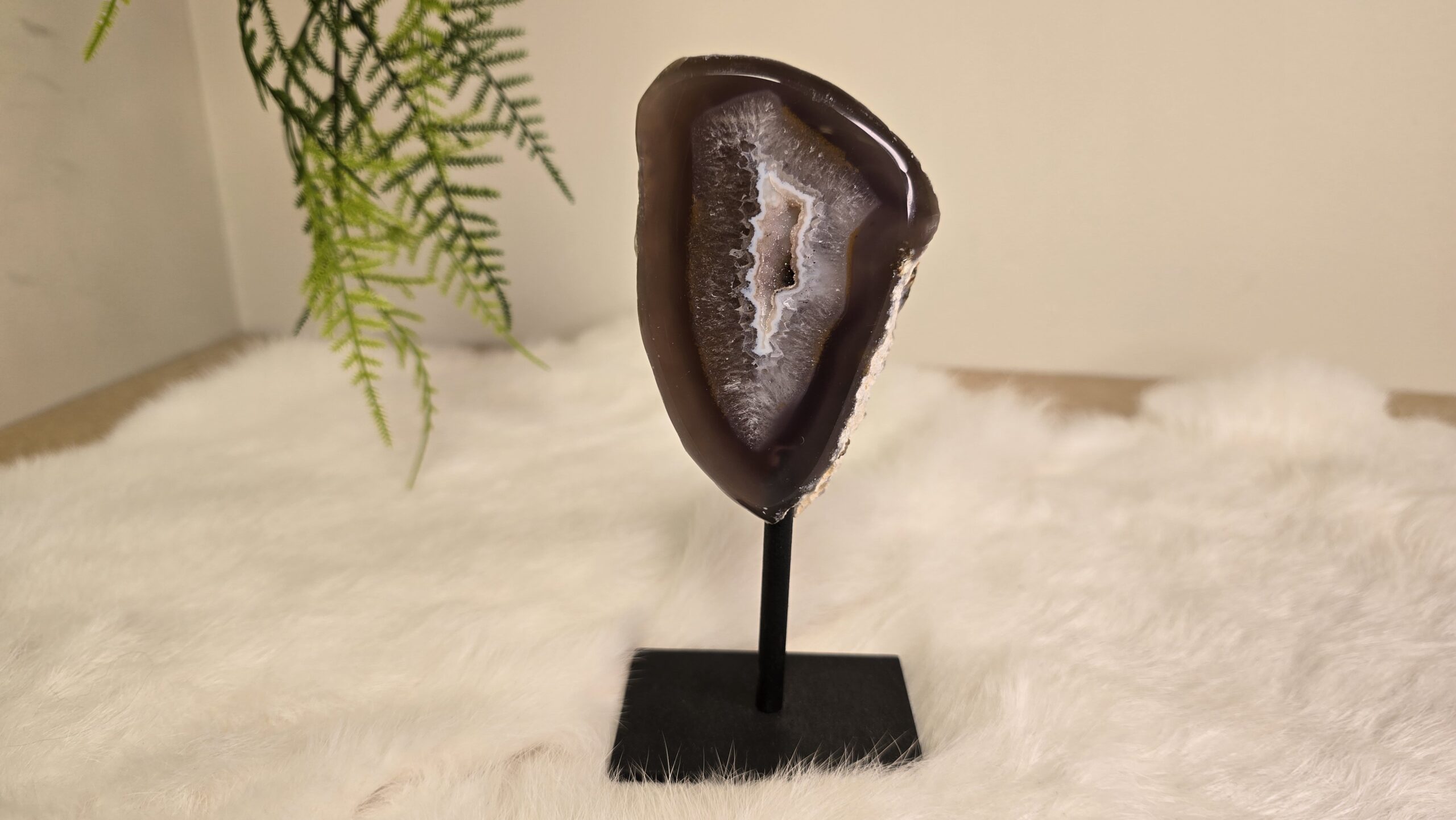 Prachtige Agaat op een metalen standaard, met schitterende kristallen.
