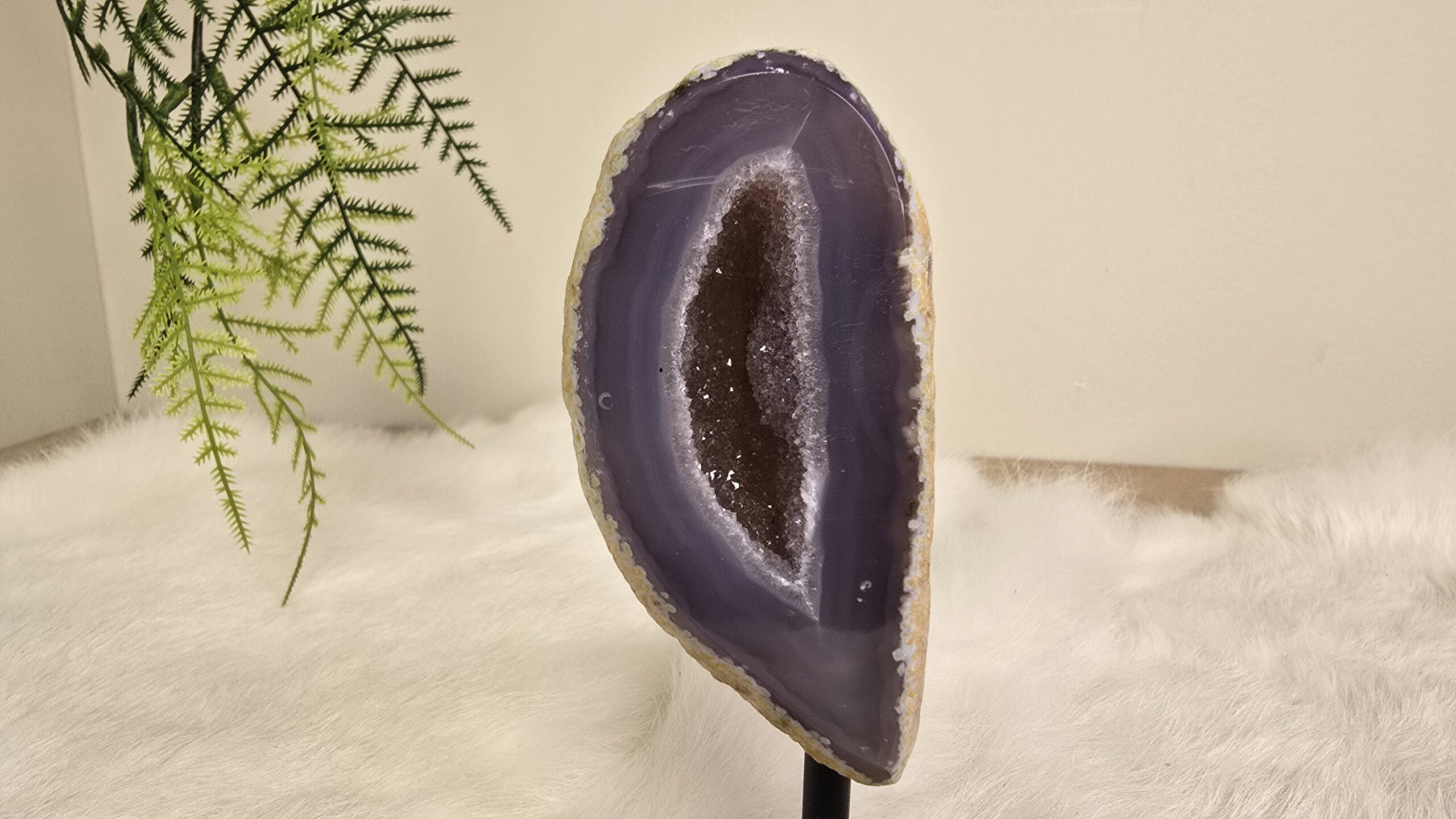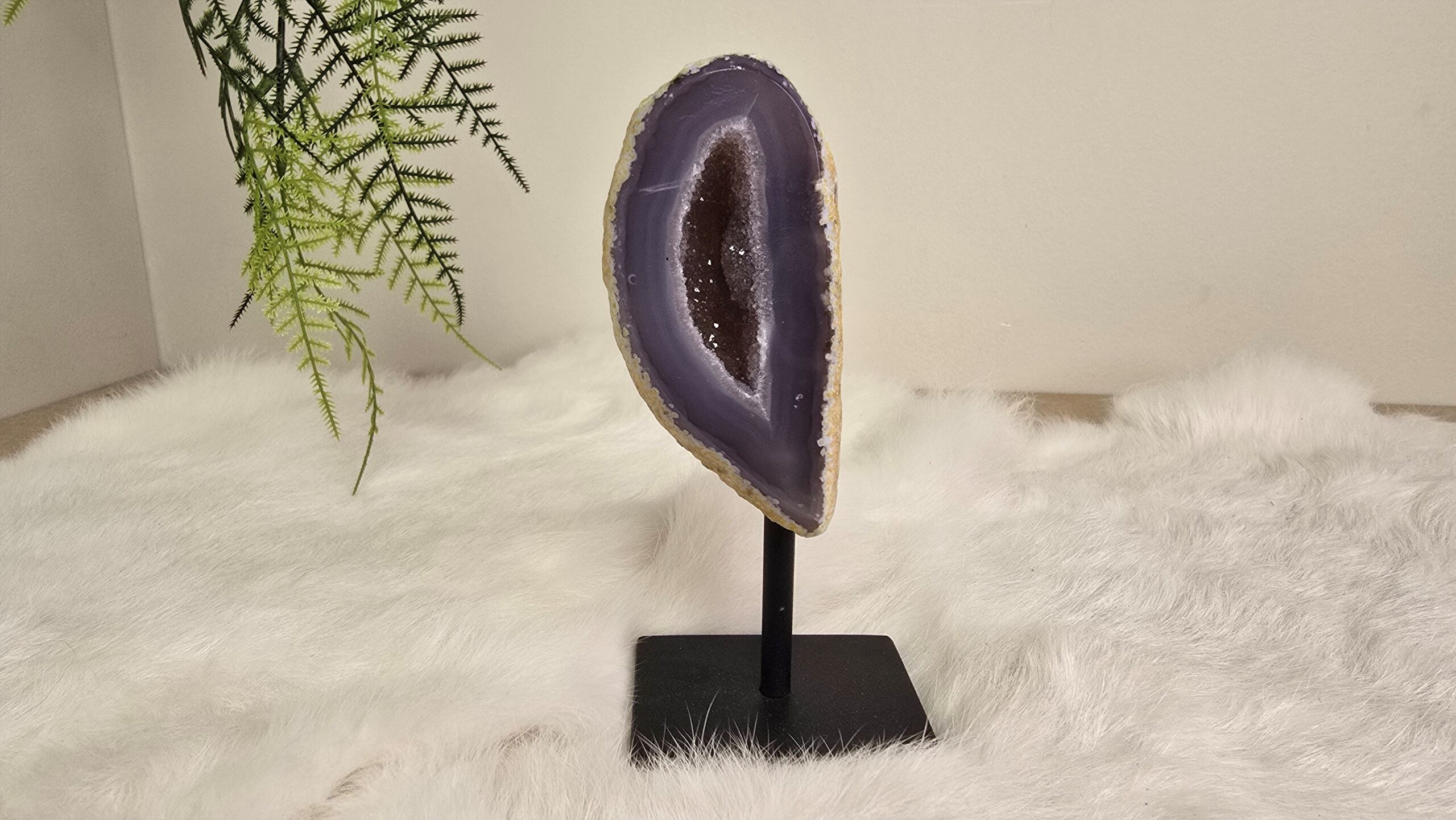 Prachtige agaat op een metalen standaard, met in de kern schitterende kristallen. Agaat is een zachte, aardende steen met een geruststellende en kalmerende energie.