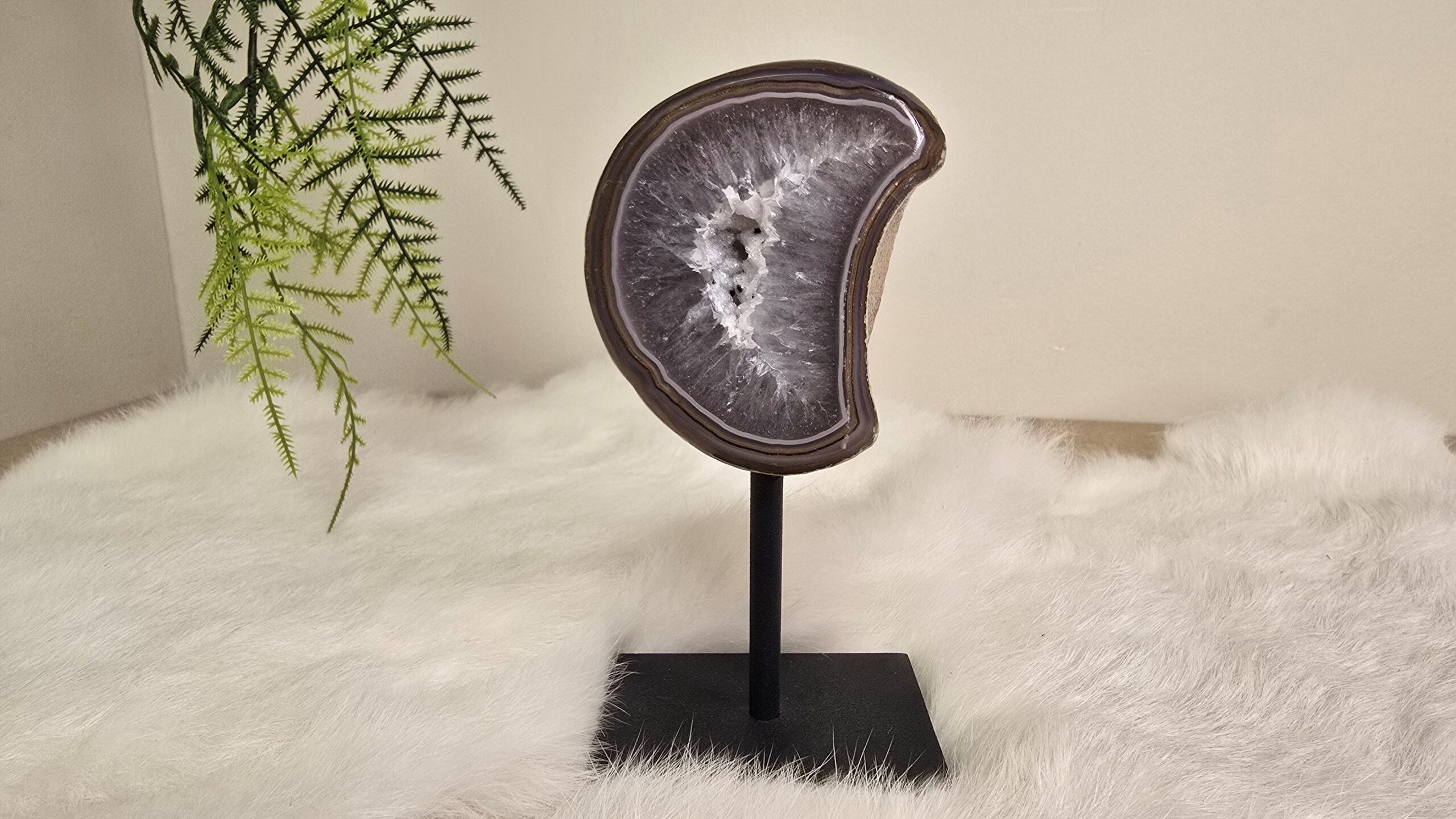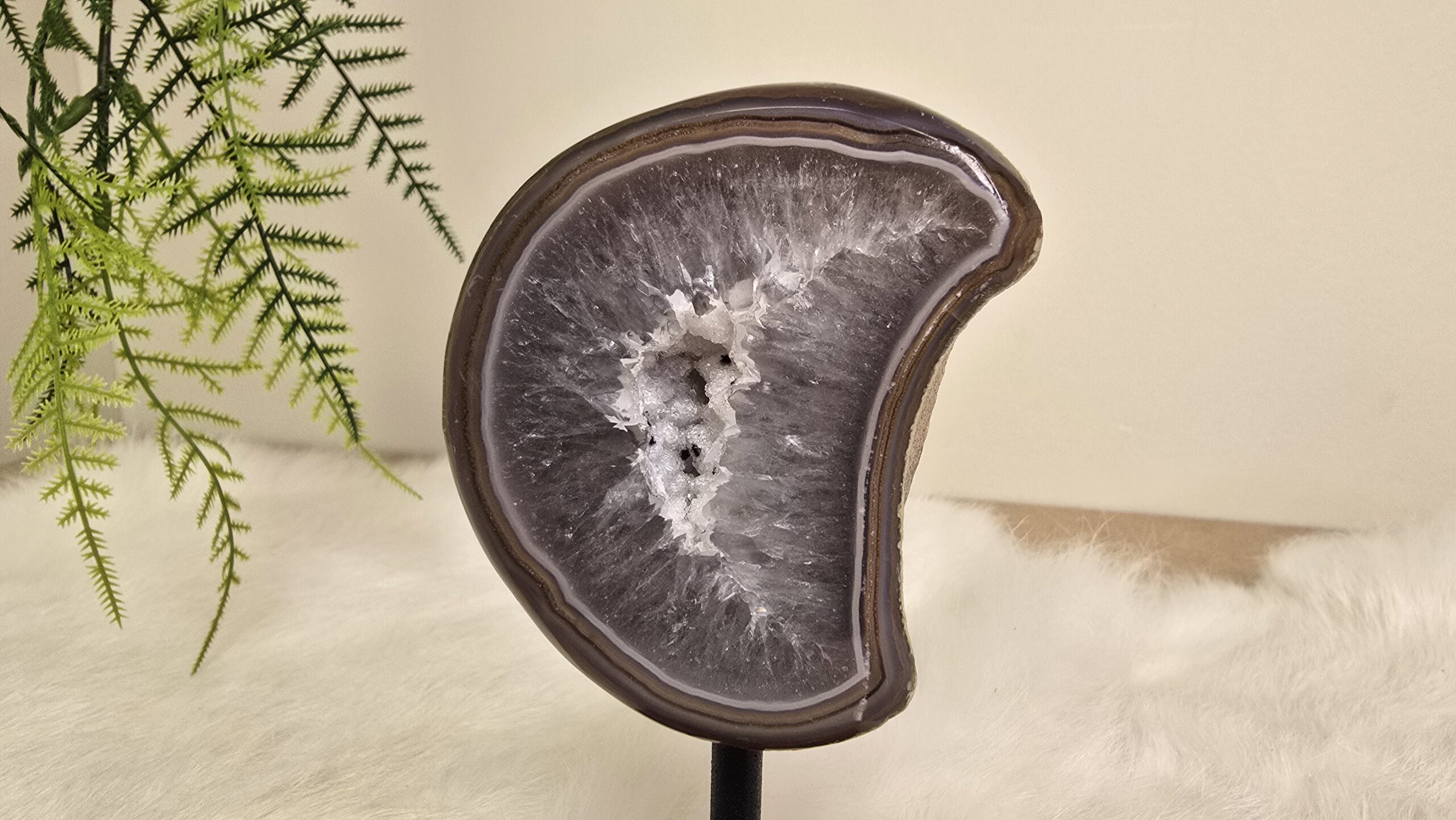 Prachtige agaat vast op een metalen standaard, met in de kern schitterende kristallen.