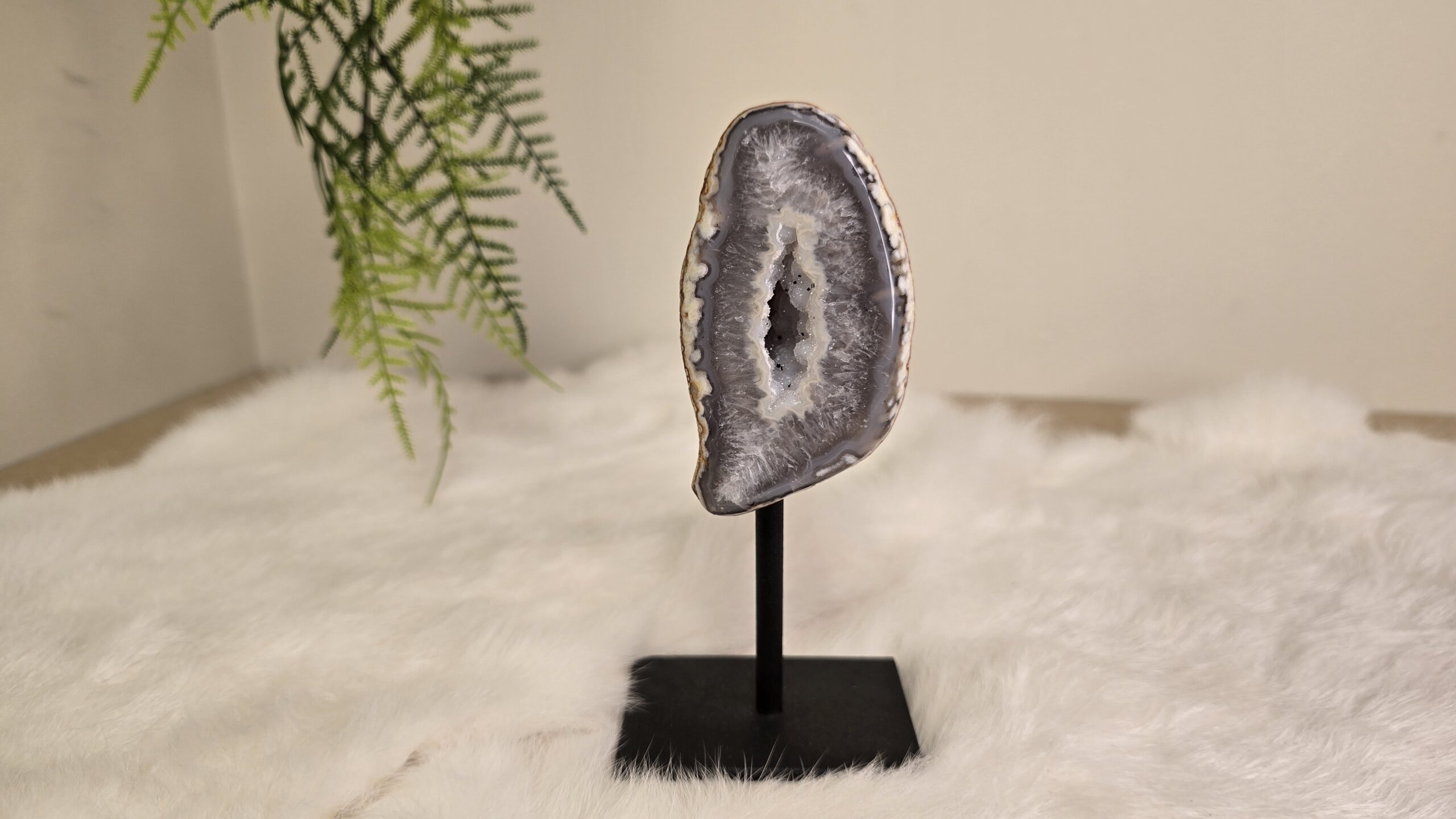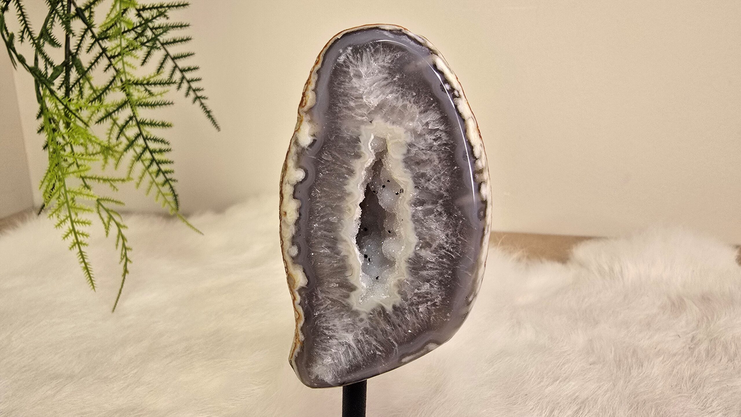 Prachtige Agaat op een metalen standaard, met schitterende kristallen.