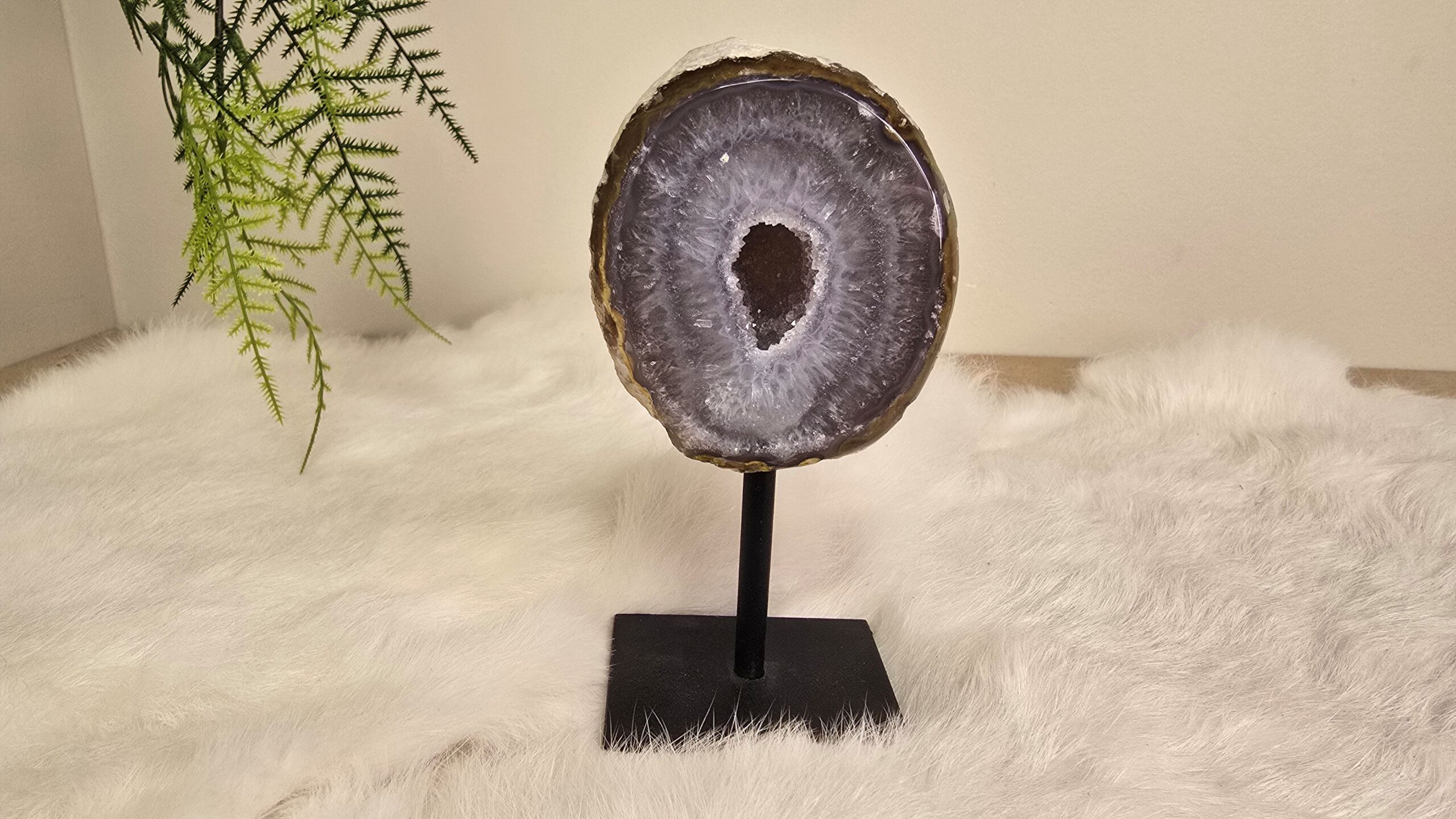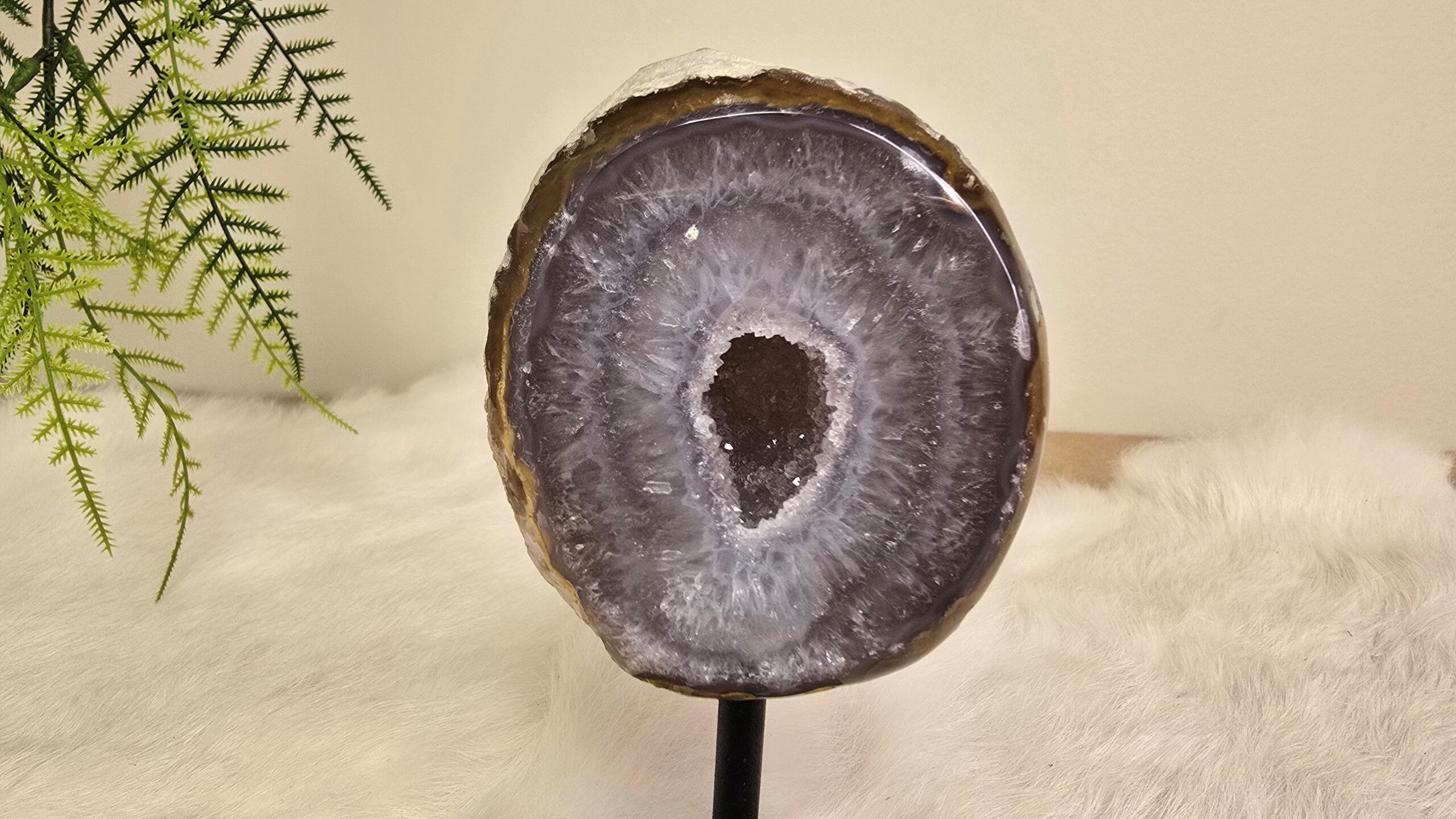 Prachtige agaat op een metalen standaard, met in de kern schitterende kristallen. Agaat is een zachte, aardende steen met een geruststellende en kalmerende energie.