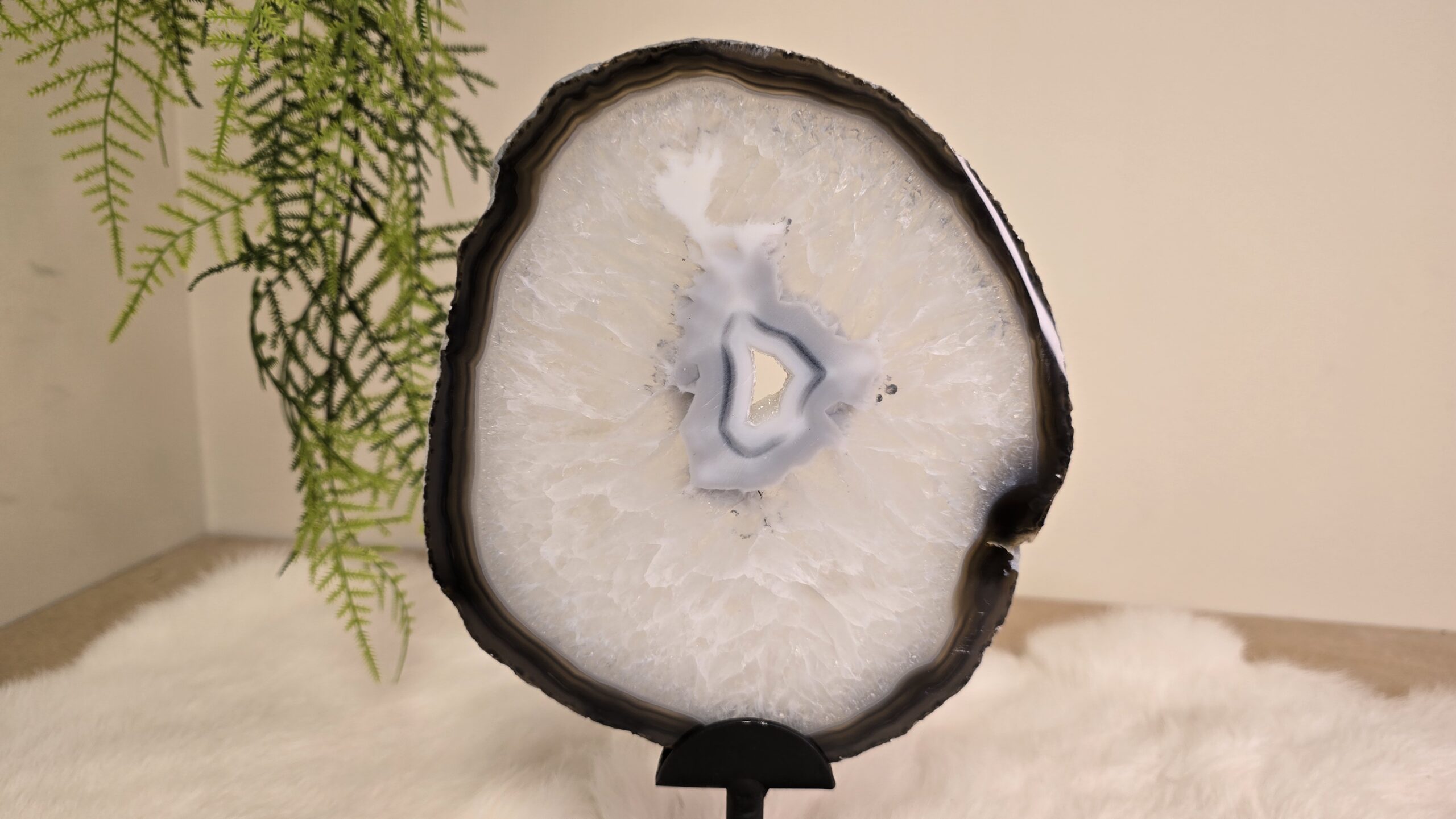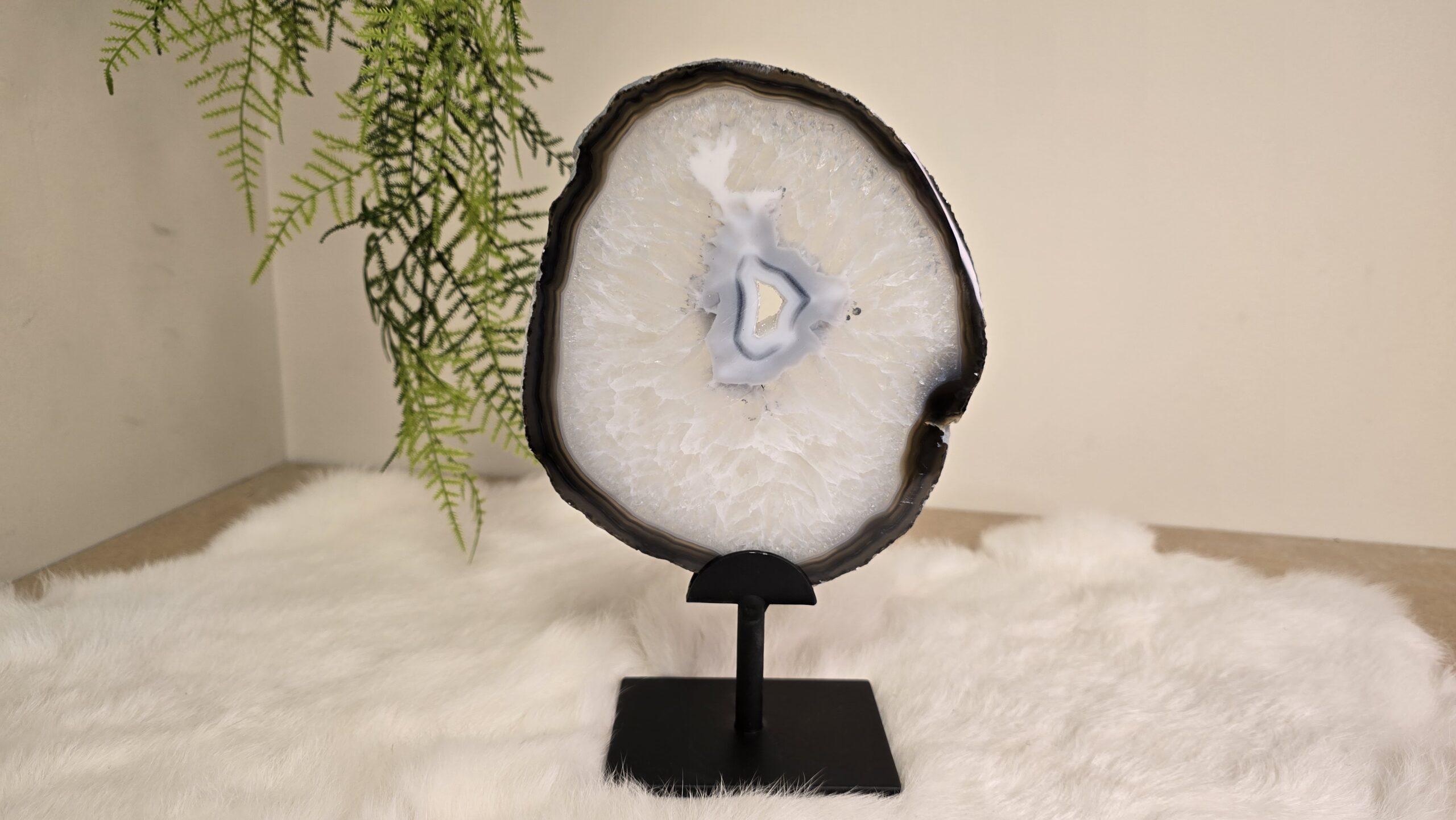Prachtige agaat schijf in een metalen standaard, met schitterende kristallen. Agaat is een zachte, aardende steen met een geruststellende en kalmerende energie.