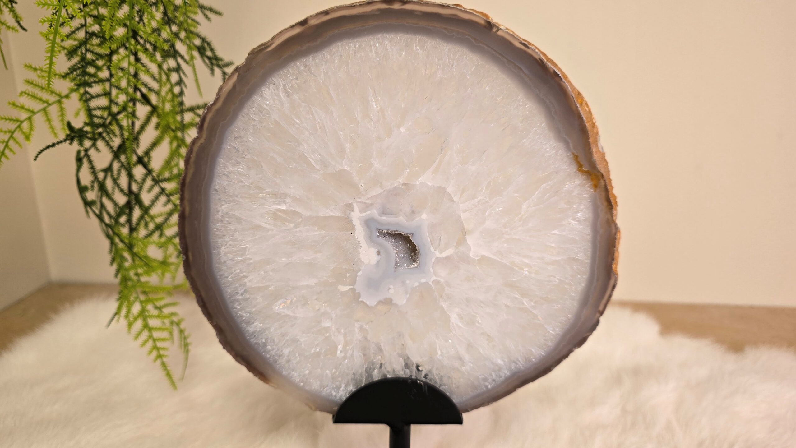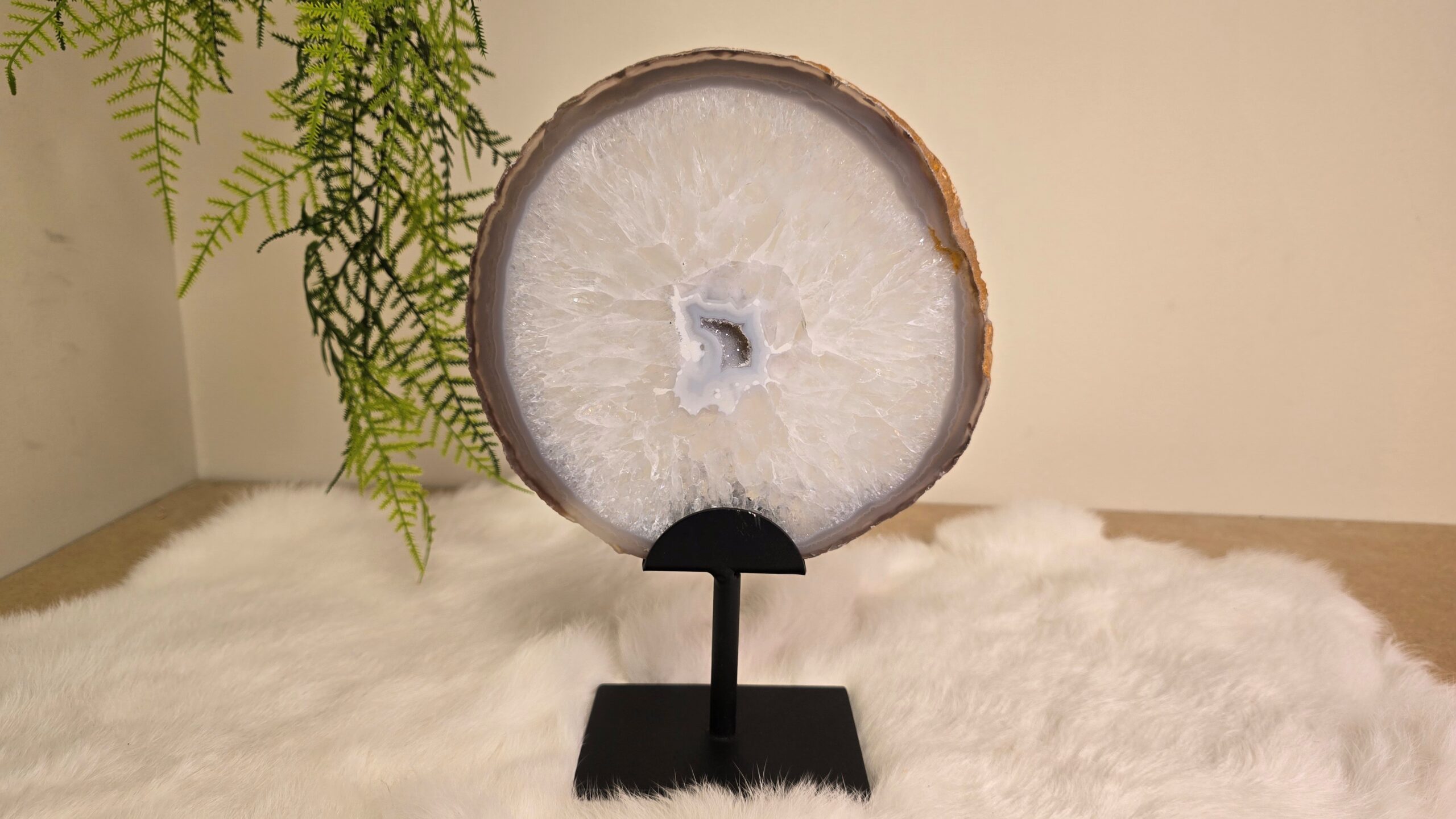 Prachtige Agaat schijf in een metalen standaard, met schitterende kristallen.