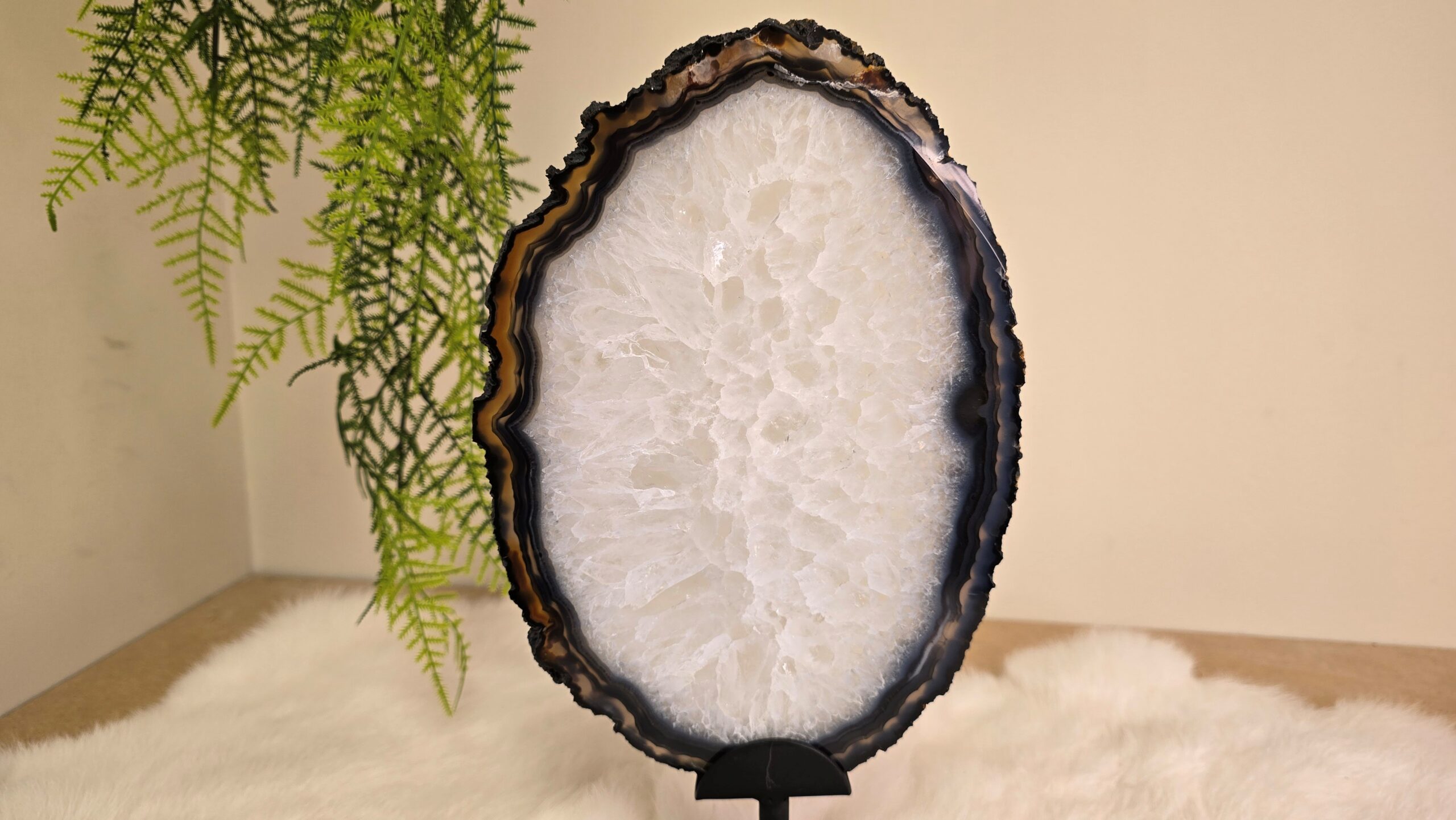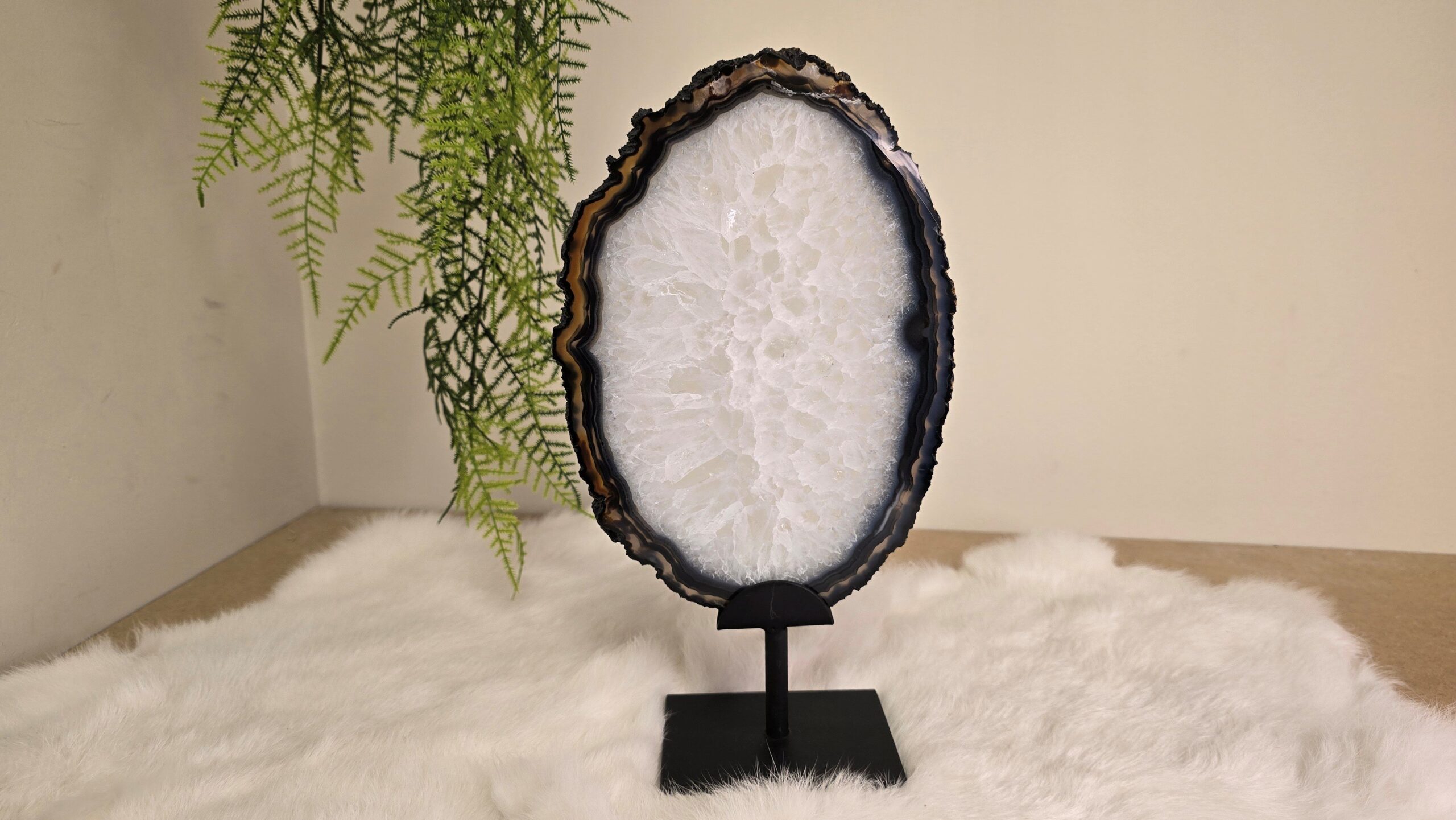 Prachtige Agaat schijf in een metalen standaard.