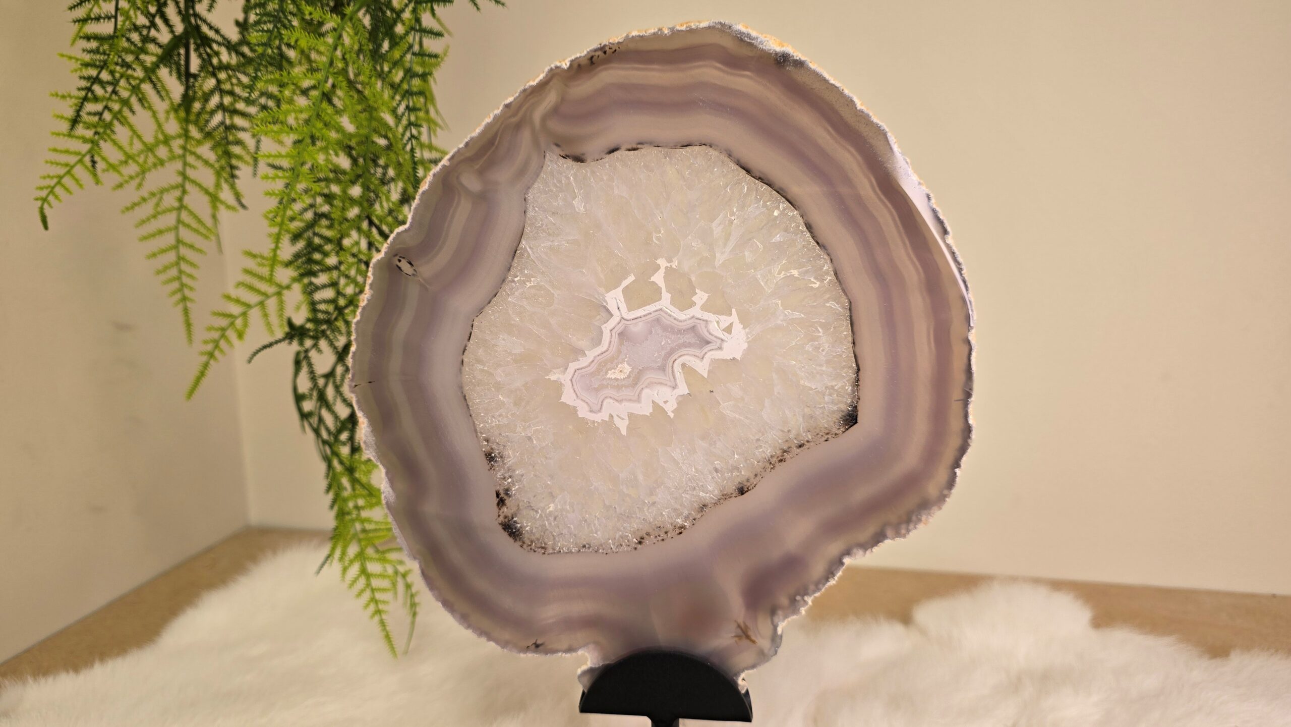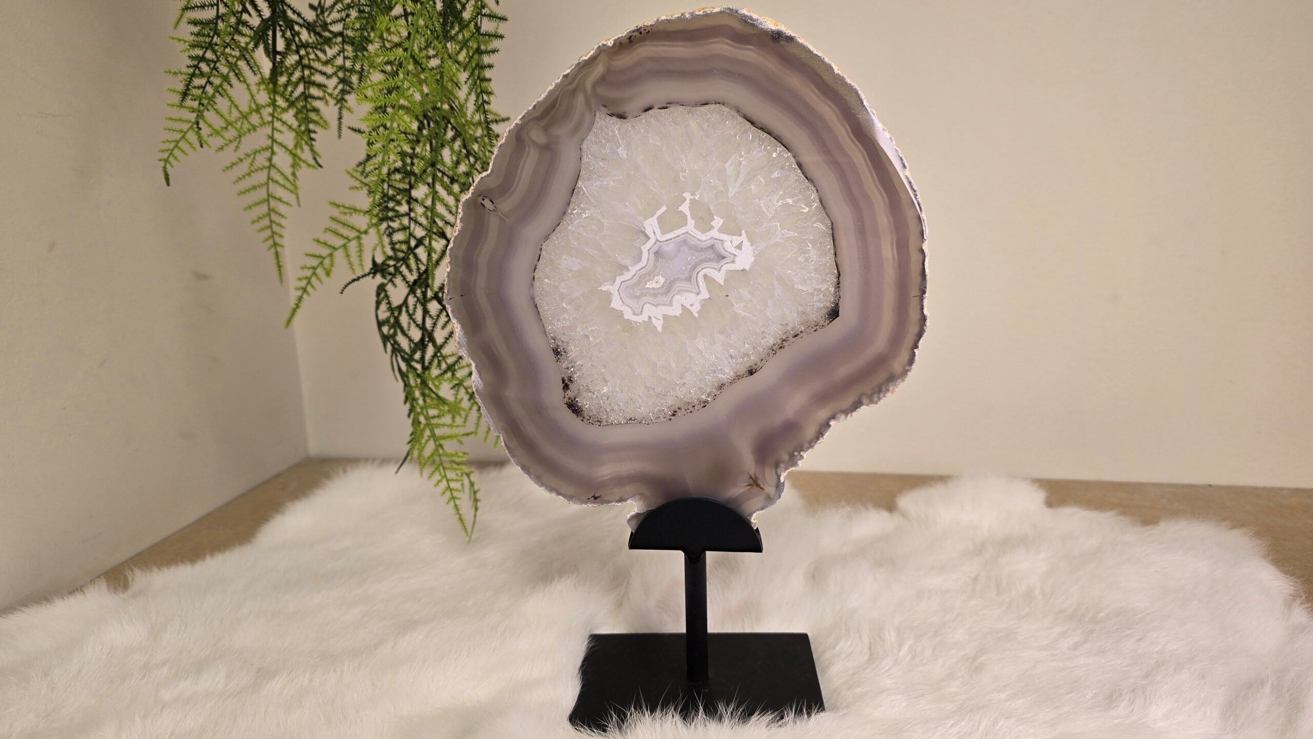 Prachtige agaat schijf in een metalen standaard. Agaat is een zachte, aardende steen met een geruststellende en kalmerende energie.