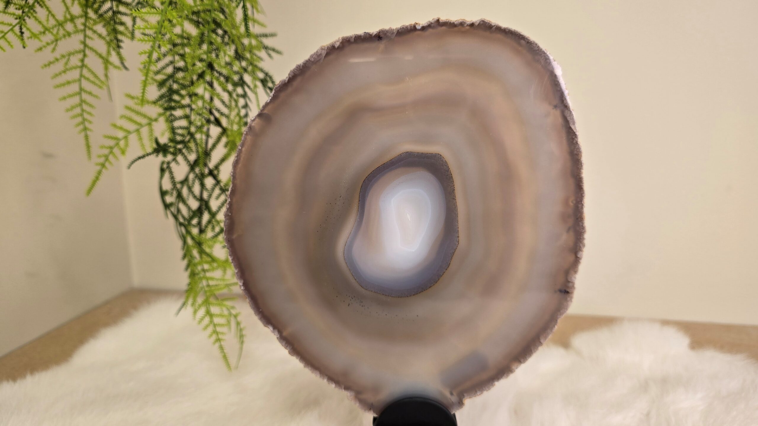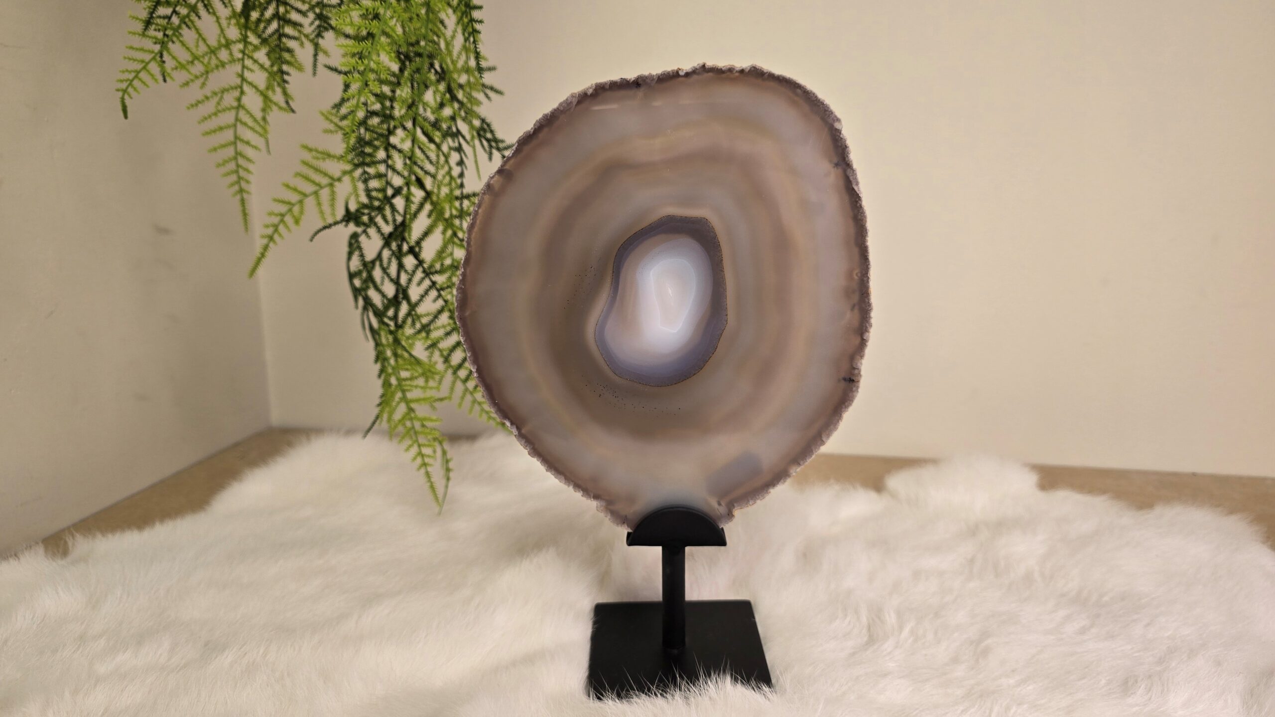 Prachtige agaat schijf in een metalen standaard. Agaat is een zachte, aardende steen met een geruststellende en kalmerende energie.