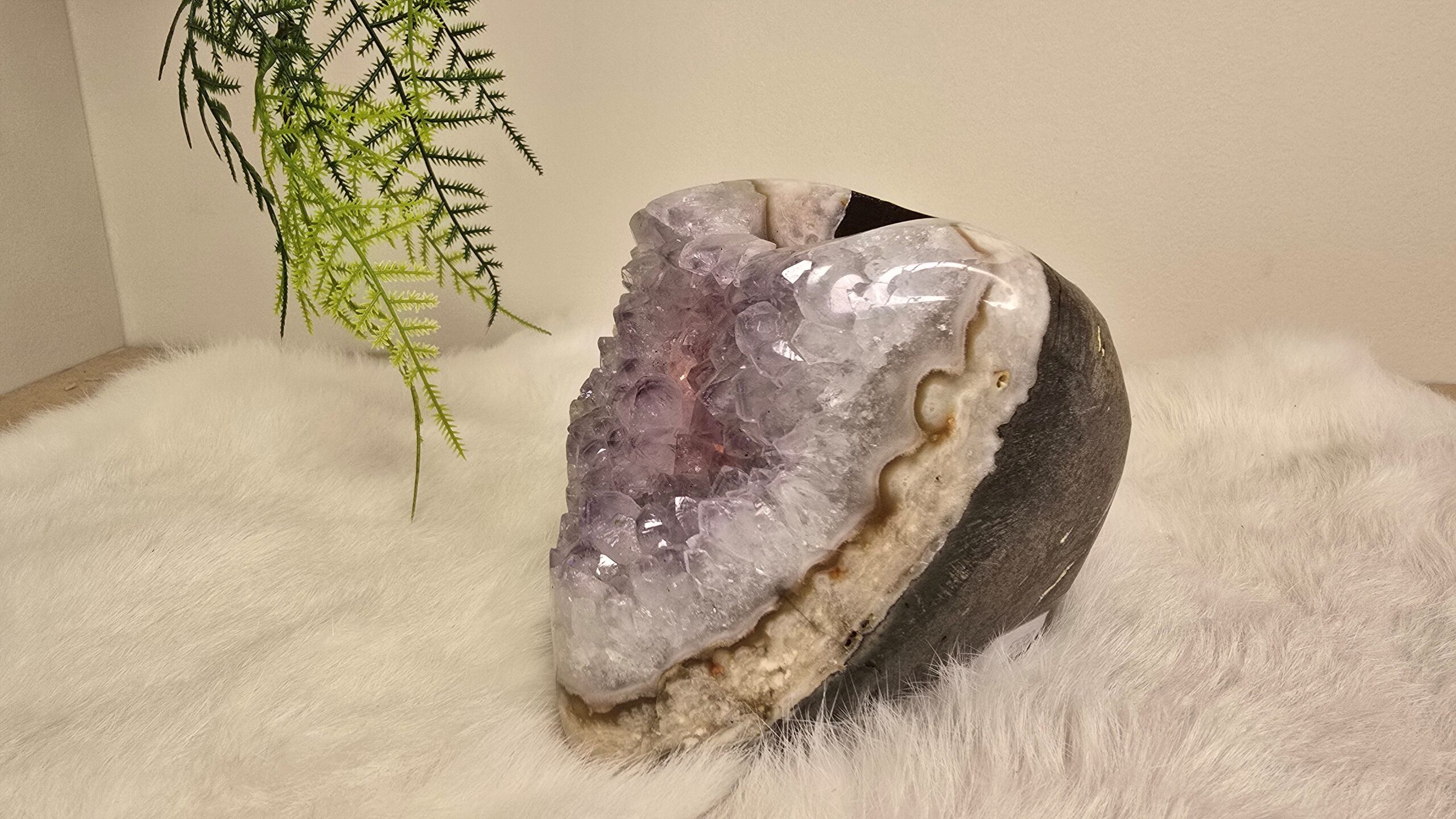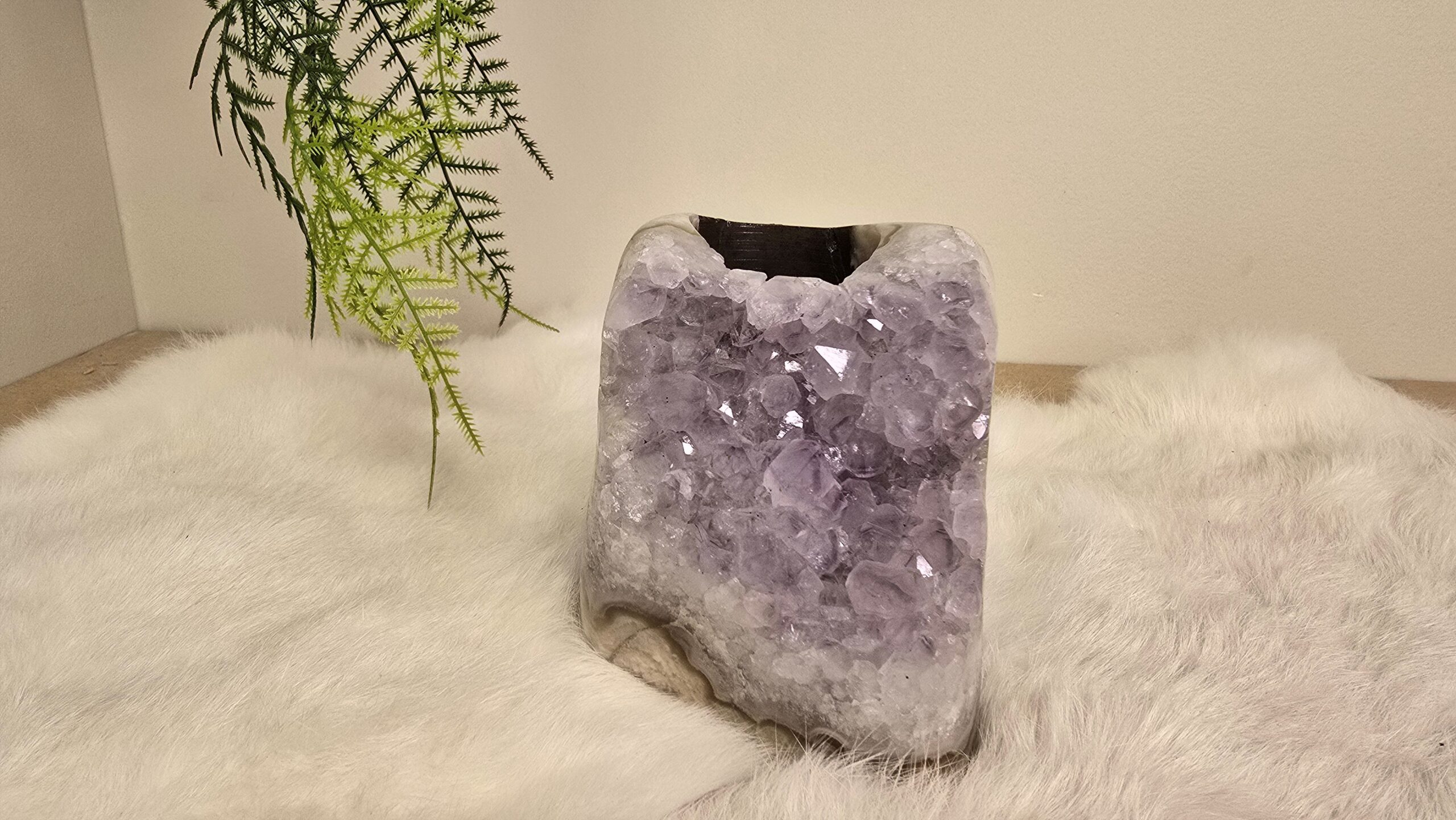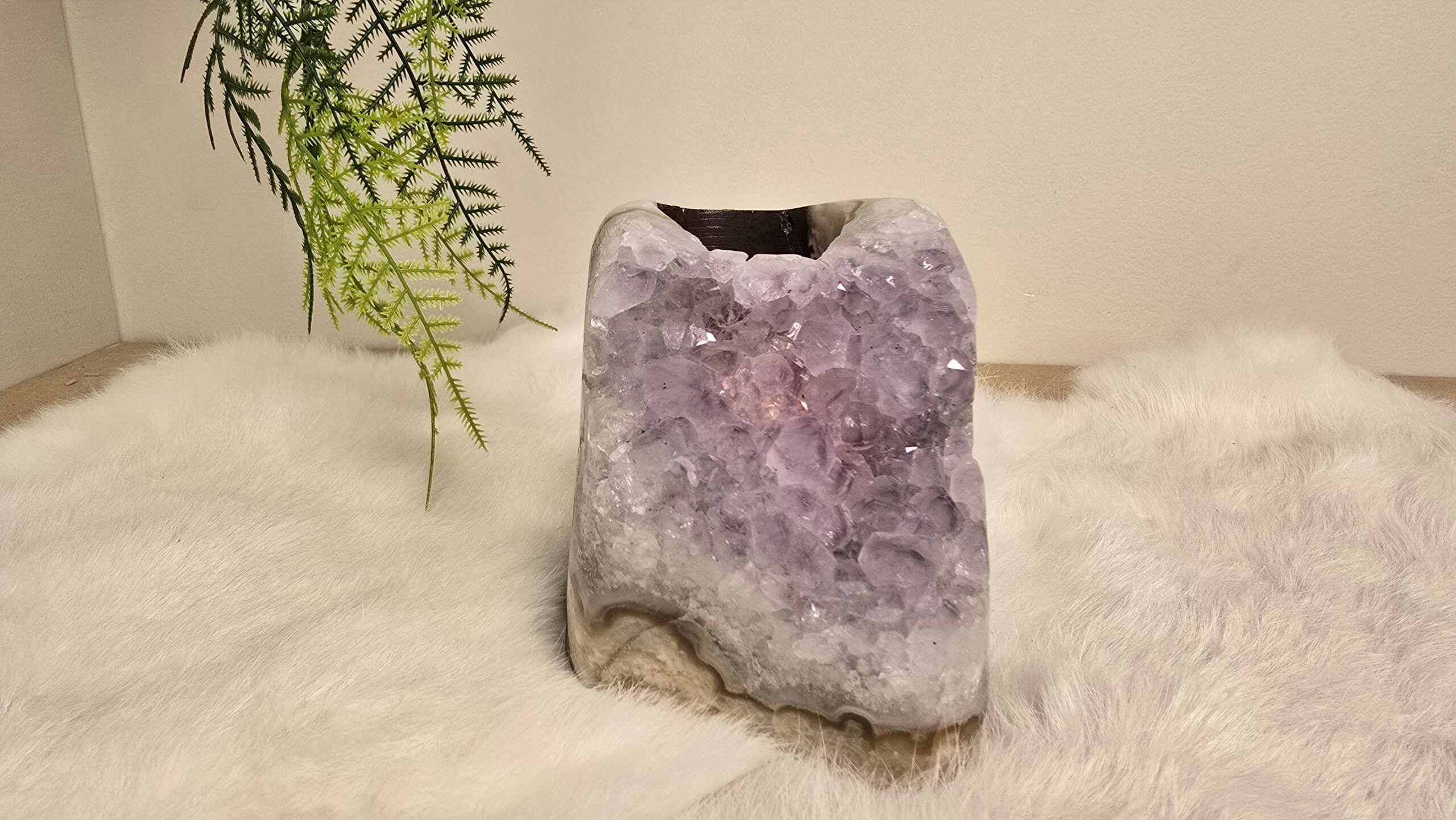 Prachtige en unieke Amethist waxinelicht met natuurlijke basalt laag en grove kristallen