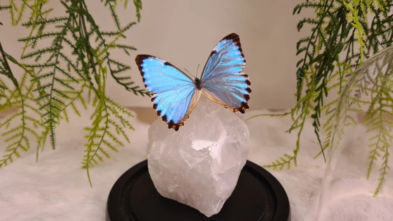Een Fantasy stolp, zwarte voet met daarin verwerkt een schitterende geslepen punt, deels ruwe Bergkristal en een prachtig en zeer bijzondere felblauwe opgezette vlinder: Morpho Portis