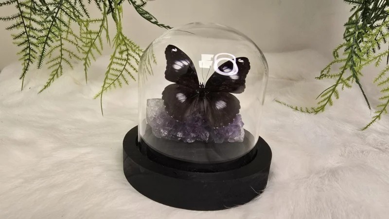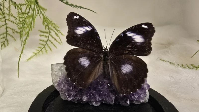 Een Fantasy stolp, zwarte voet met daarin verwerkt een schitterende Amethist cluster stuk met kristallen en een donkerblauwe opgezette vlinder: Hypolimnas Bolina