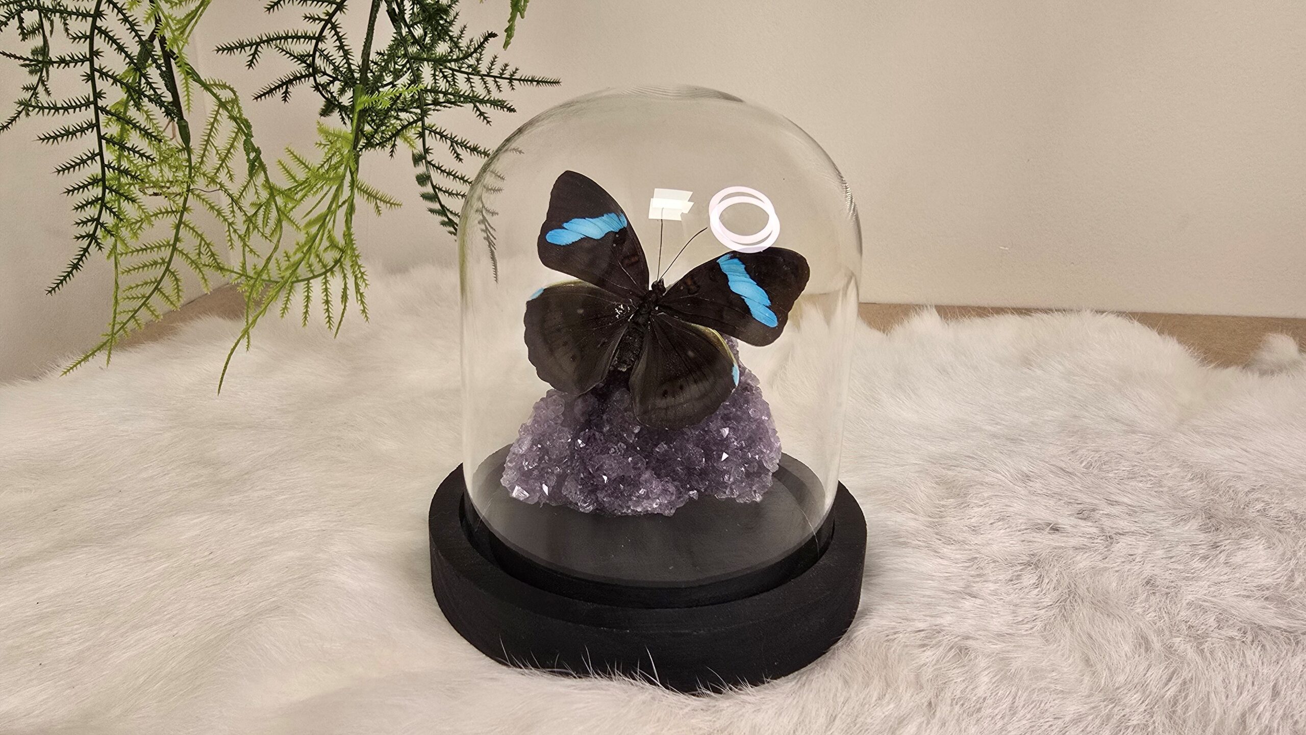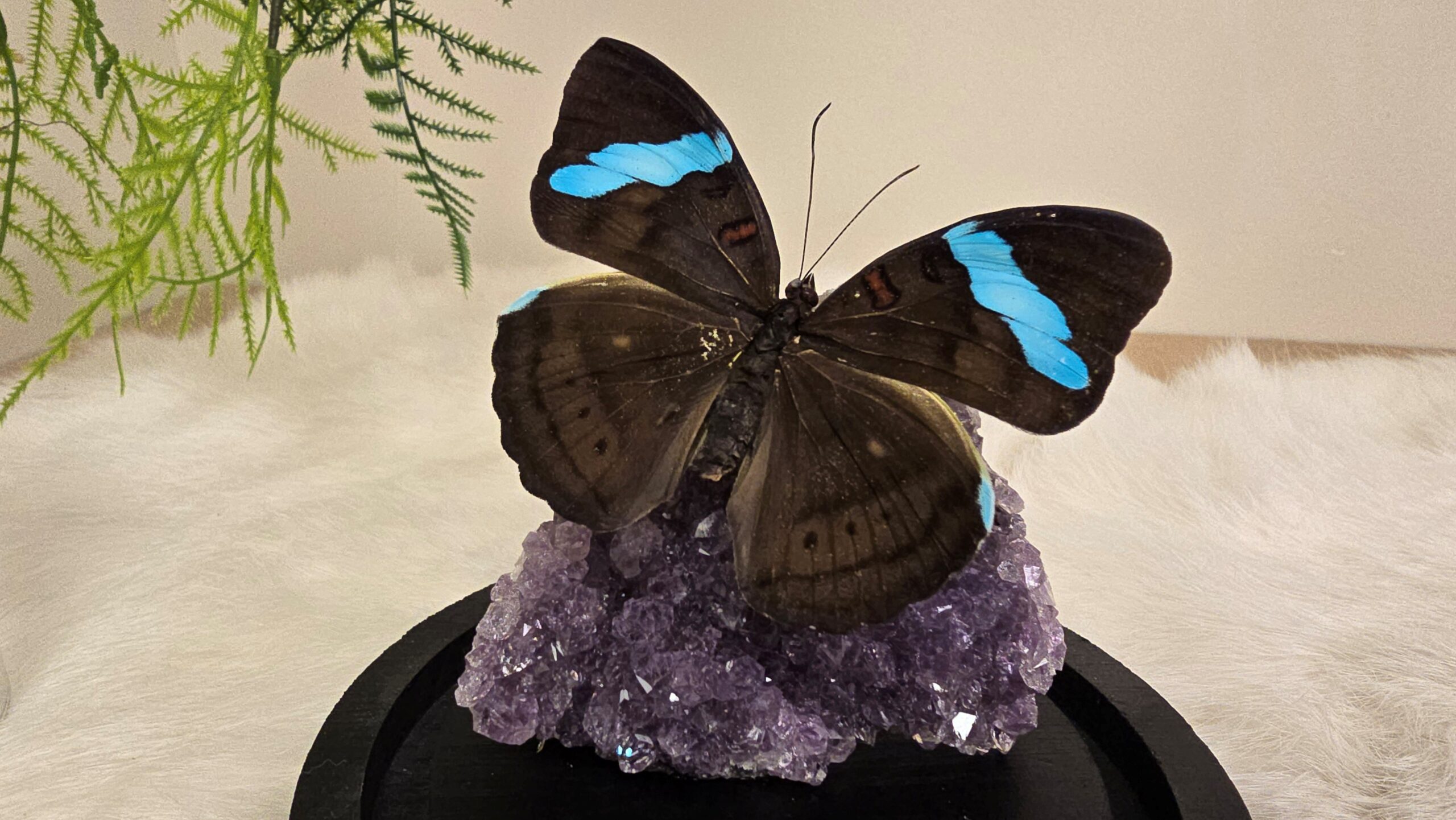 Een Fantasy stolp, zwarte voet met daarin verwerkt een cluster stuk met schitterende kristallen van Amethist en een prachtige zwart/bruine, blauwe opgezette vlinder: Nessea Hewitsonii