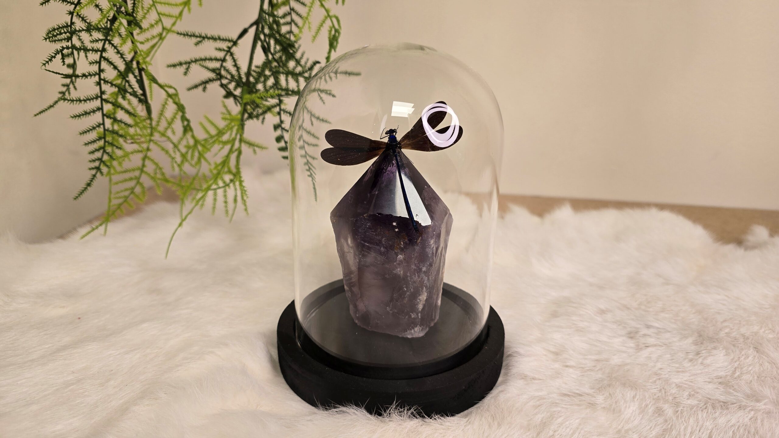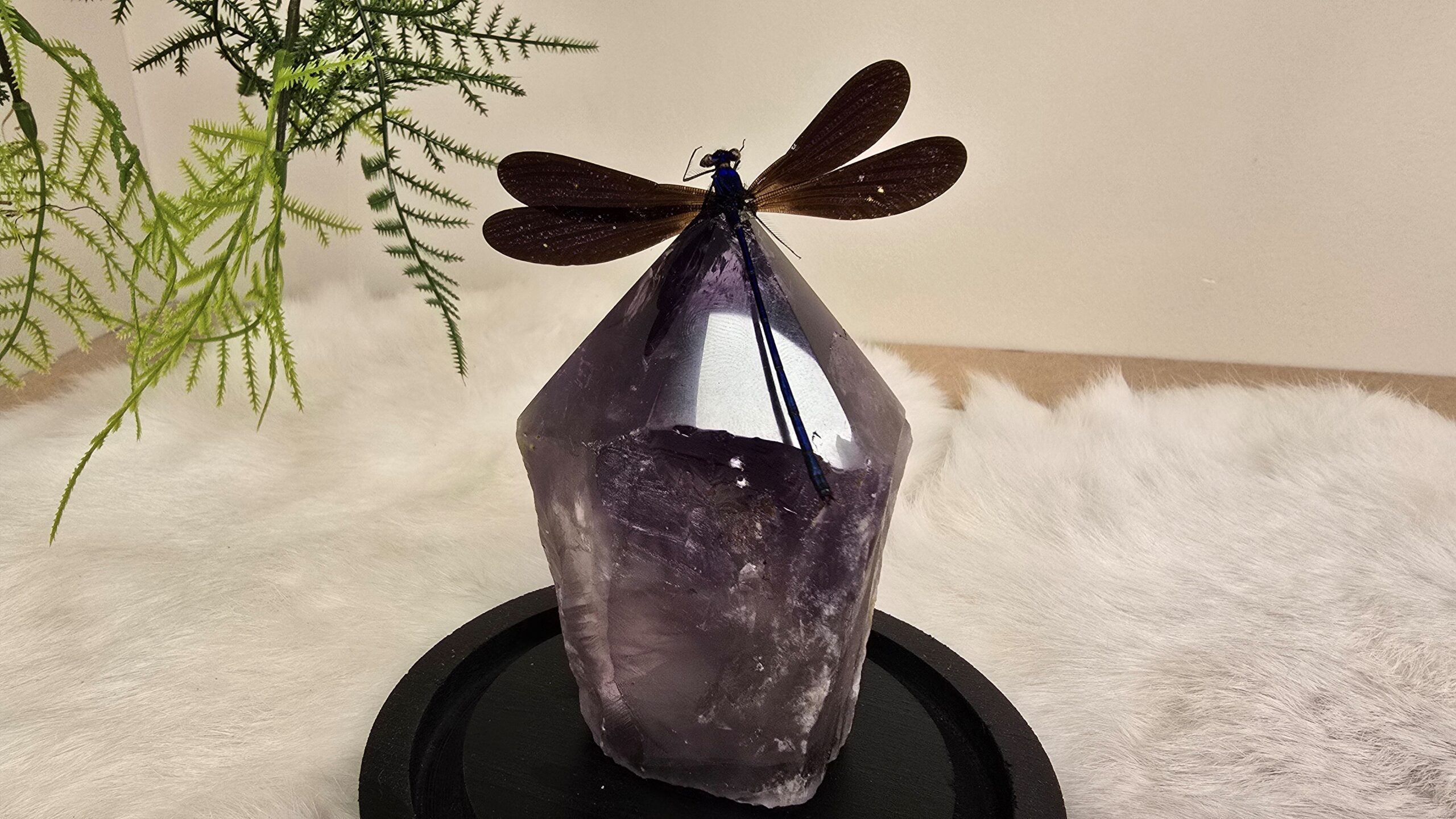 Een Fantasy stolp, zwarte voet met daarin verwerkt een eslepen punt (zijkant ruw) van Amethist en een prachtige blauwe opgezette libelle: Vestalis Luctuosa