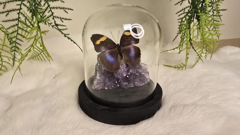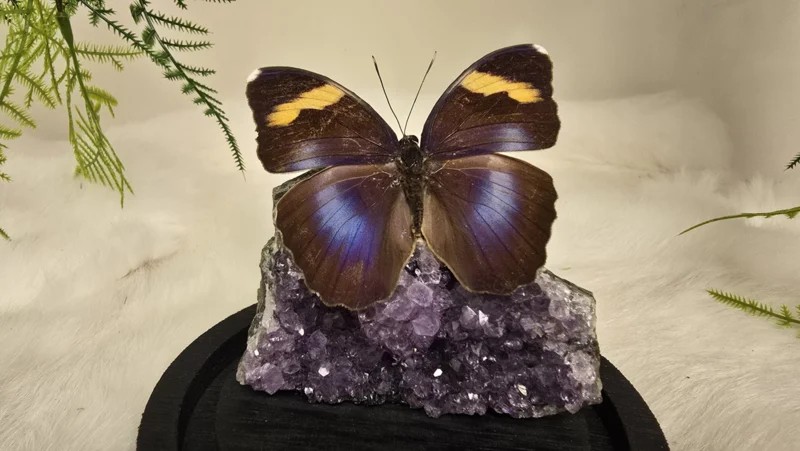 Een Fantasy stolp, zwarte voet met daarin verwerkt een cluster stuk met schitterende kristallen van Amethist en een prachtige geel, blauw, paarse opgezette vlinder: Euphaedra Medon Medon