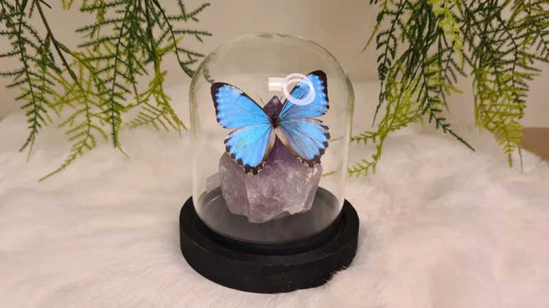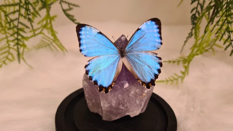 Een Fantasy stolp, zwarte voet met daarin verwerkt een punt (gepolijst)/ deels ruw van Amethist en een prachtige felblauwe opgezette vlinder: Morpho Portis