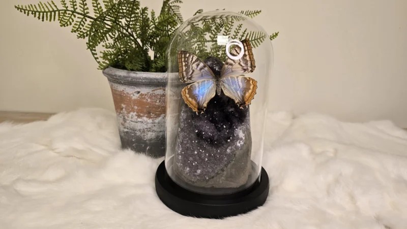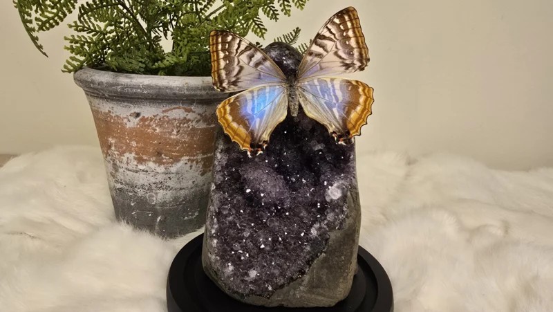 Een Fantasy stolp, zwarte voet met daarin verwerkt een schitterende Amethist cluster stuk met kristallen en een bijzondere blauwe opgezette vlinder: Morpho Sulkowskyi female