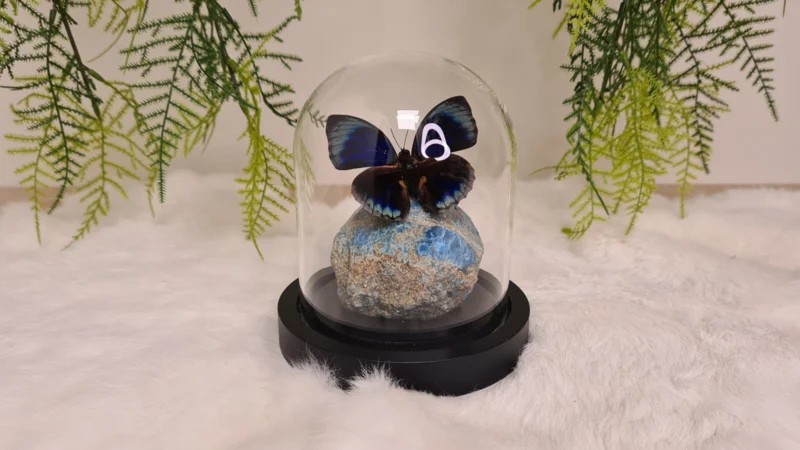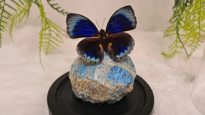 Een Fantasy stolp, zwarte voet met daarin verwerkt een punt (gepolijst)/ deels ruw van Apatiet en een prachtige donkerblauwe opgezette vlinder: Agrias Beautifica