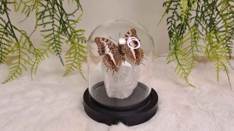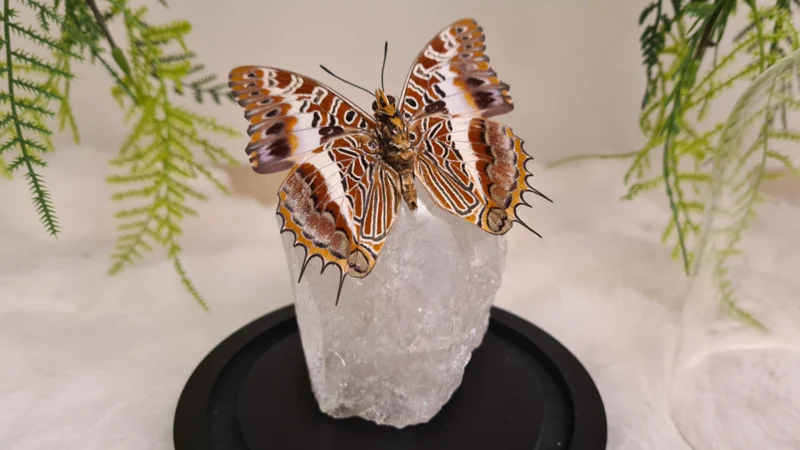 Een Fantasy stolp, zwarte voet met daarin verwerkt een punt (gepolijst)/ deels ruw van Bergkristal en een prachtige oranje, bruin, witte opgezette vlinder: Charaxes Brutus, met juist de prachtige patronen van de achterzijde in zicht geplaatst