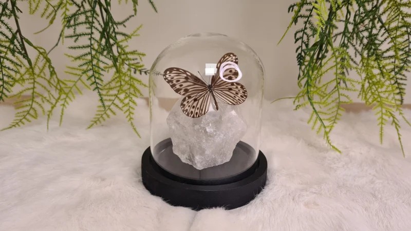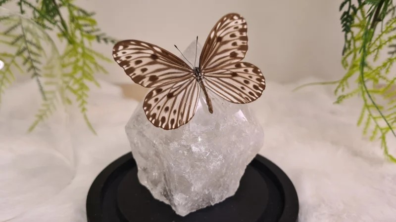Een Fantasy stolp, zwarte voet met daarin verwerkt een punt (gepolijst)/ deels ruw van Bergkristal en een prachtige creme, bruine opgezette vlinder: Ideopsis Gaura