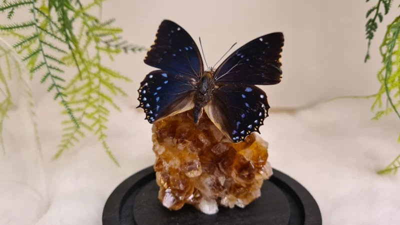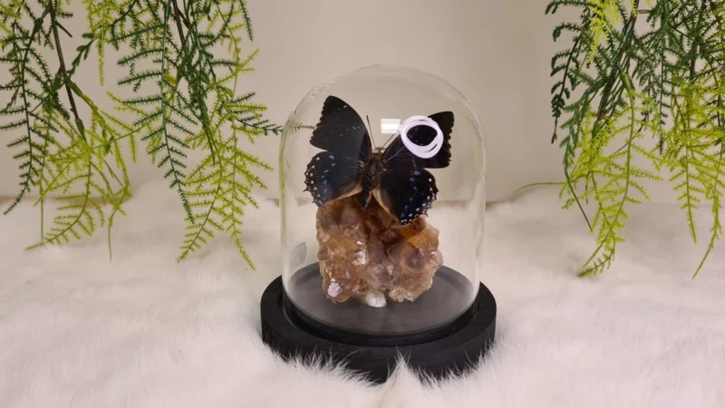 Een Fantasy stolp, zwarte voet met daarin verwerkt een Citrien (gebrande) en een prachtige donkerblauwe opgezette vlinder: Charaxes Tiridates