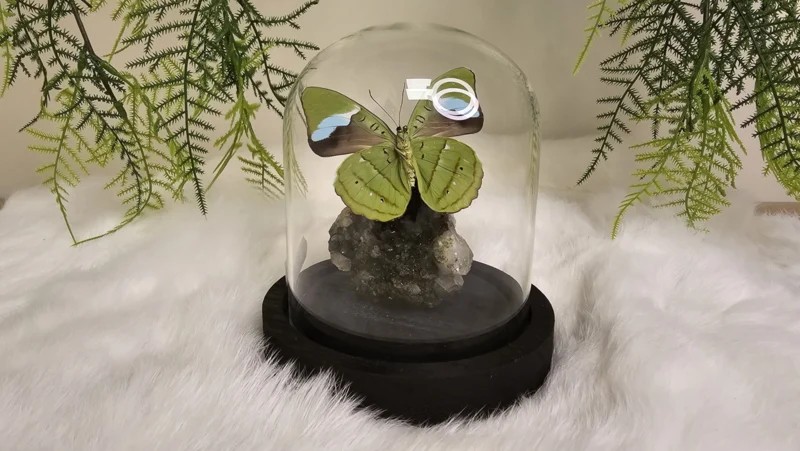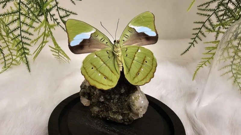 Een Fantasy stolp, zwarte voet met daarin verwerkt een schitterende en bijzondere cluster stuk Forest Epidoot en een prachtige groene opgezette vlinder: Nessaea Hewitsoni, met juist de schitterende achterkant aan de voorzijde