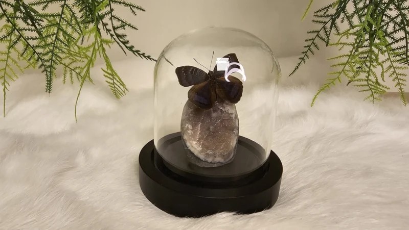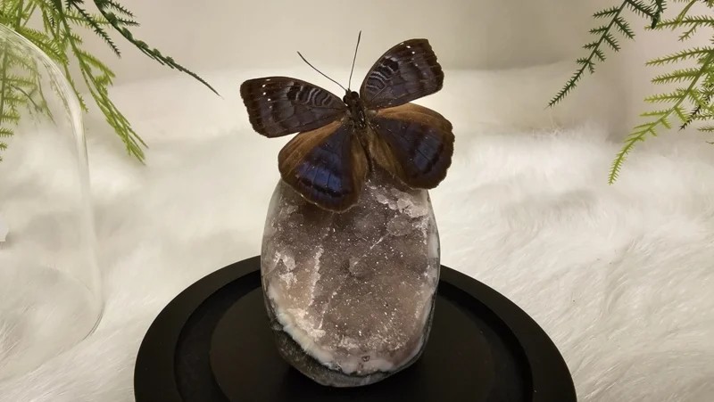 Een Fantasy stolpje, zwarte voet met daarin verwerkt een cut base stukje van Galaxy Amethist met schitterende, fonkelende kristallen en een prachtige donkerblauw, bruine opgezette vlinder: Junonia ssp.