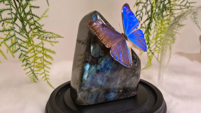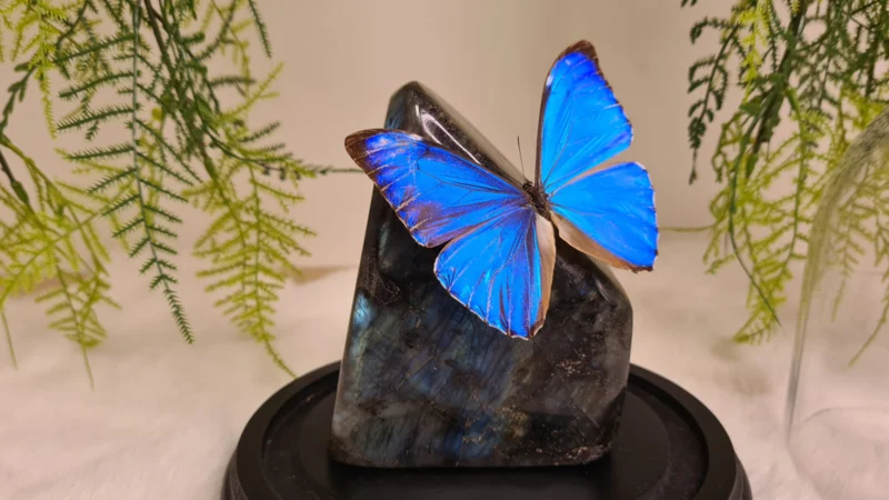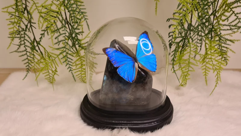 Een Fantasy stolp, ovaal, zwarte voet met daarin verwerkt een schitterende Labradoriet, rondom gepolijst, uit Madagascar en een felblauwe opgezette vlinder: Morpho Aurora