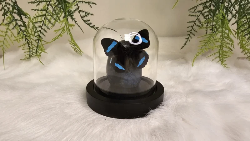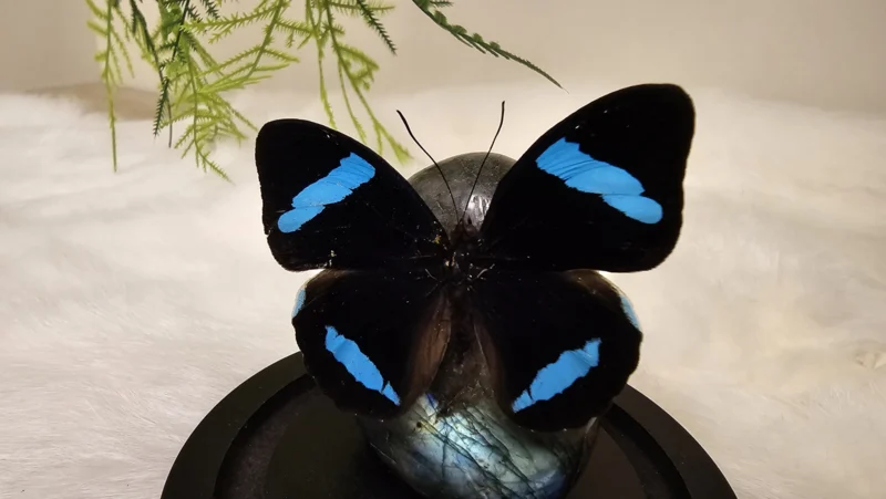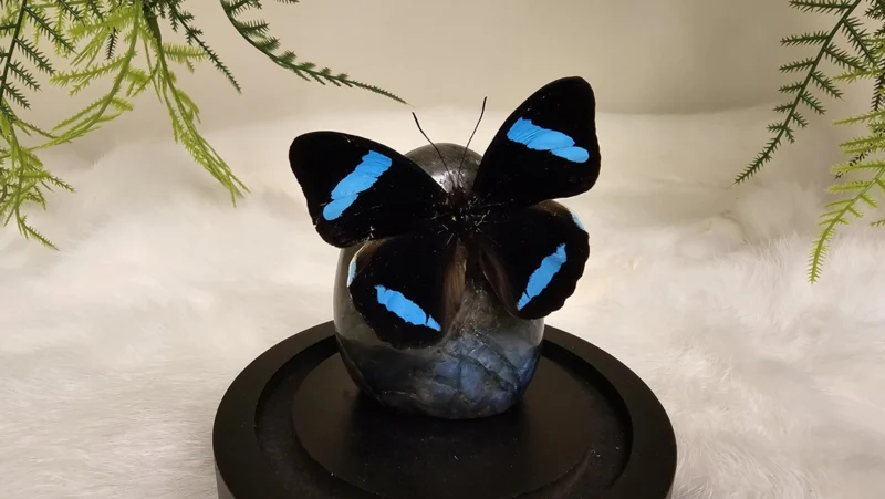 Een Fantasy stolp, zwarte voet met daarin verwerkt een schitterende free form gepolijst Labradoriet stuk en een prachtige blauw, zwarte opgezette vlinder: Nessaea Hewitsoni