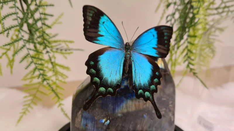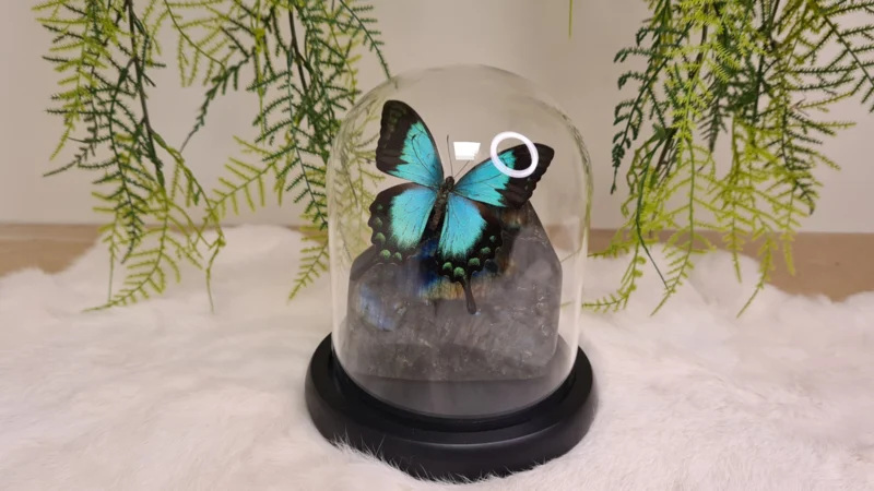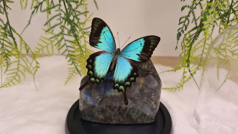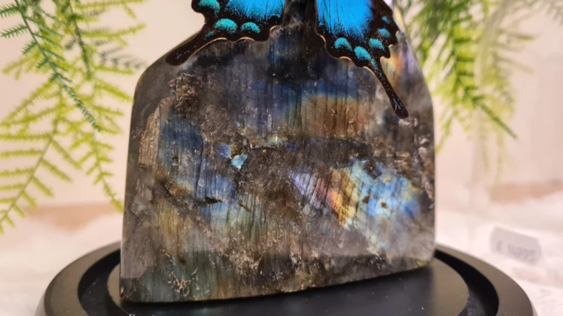 Een Fantasy stolp, zwarte voet met daarin verwerkt een schitterende Labradoriet, uit Madagascar en een zeegroen, blauwe opgezette vlinder: Papilio Lorquinianus