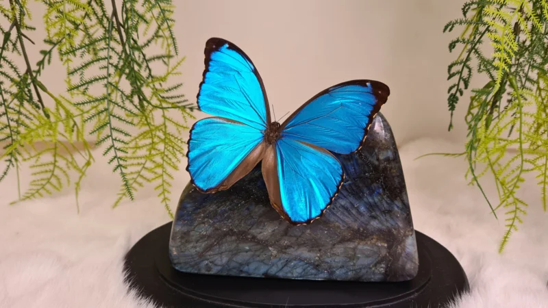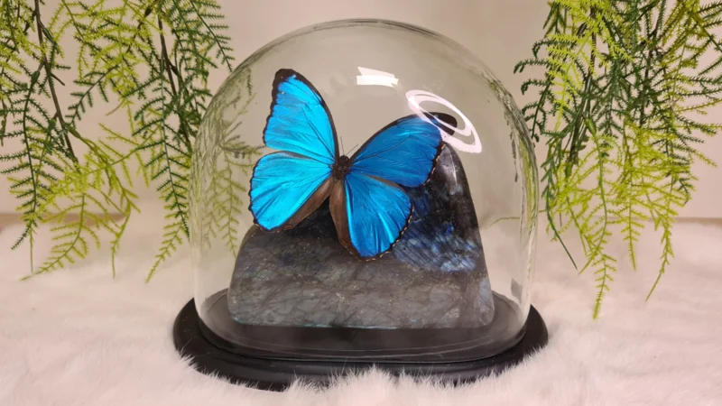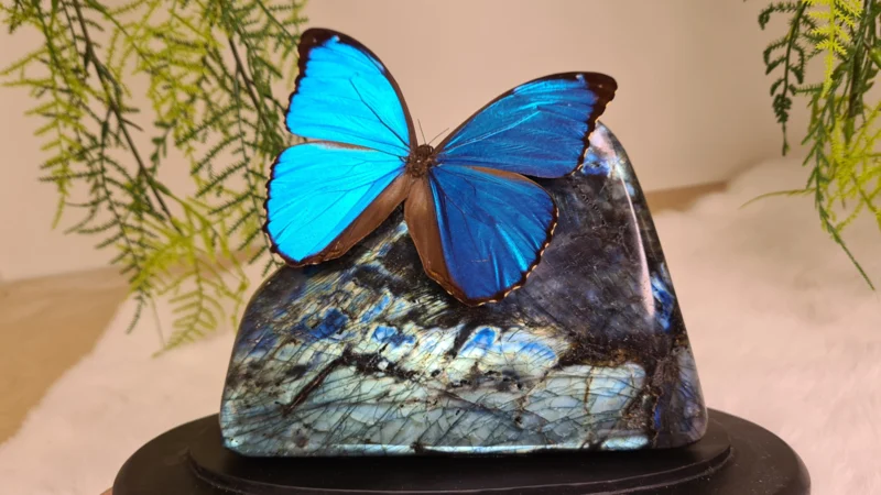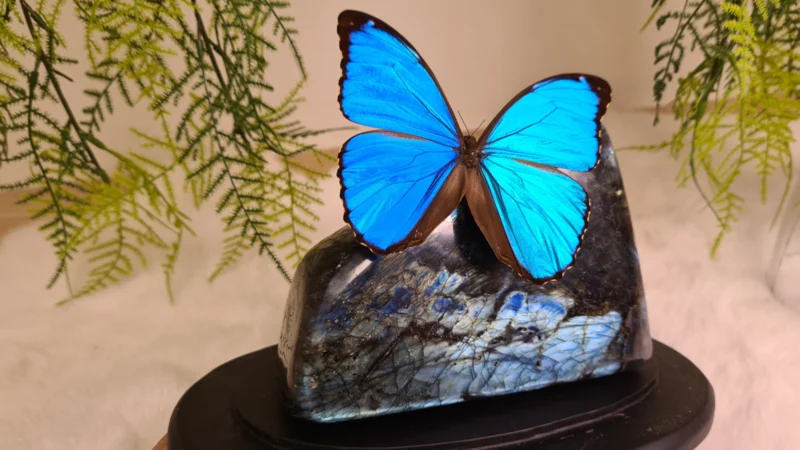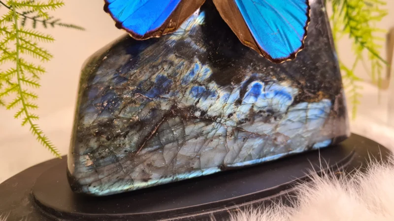 Een Fantasy stolp, ovaal, zwarte voet met daarin verwerkt een schitterende Labradoriet, rondom gepolijst, uit Madagascar en een felblauwe opgezette vlinder: Morpho Aurora