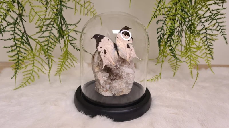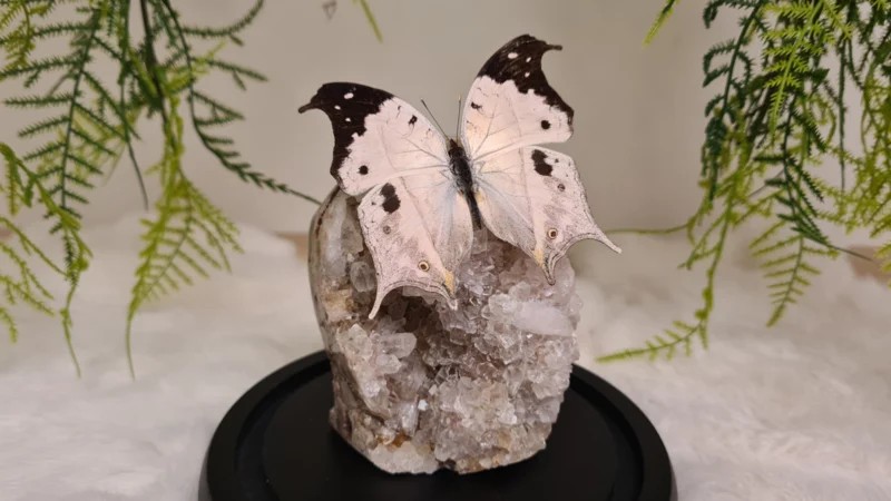 Een Fantasy stolp, zwarte voet met daarin verwerkt een schitterende lichte kleur free form Roze Amethist cluster en een prachtige lichte parlemoer kleurige opgezette vlinder: Salamis Duprei