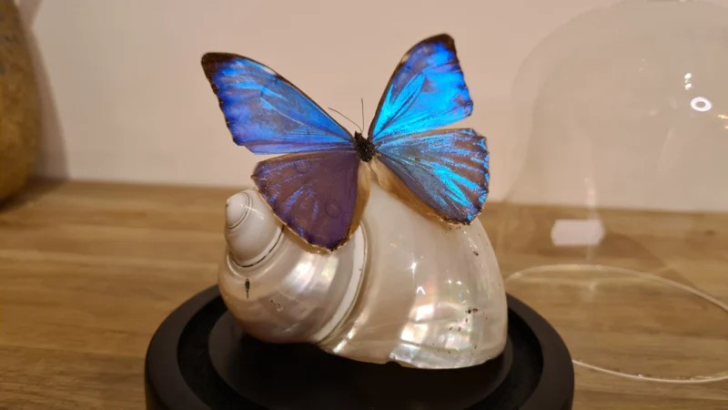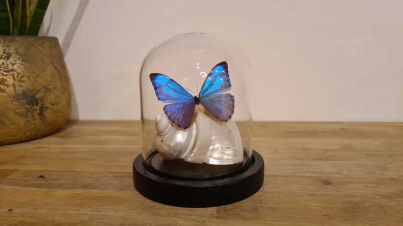 Een Fantasy stolp, zwarte voet met daarin verwerkt, een bijzondere parlemoer schelp: Turbo Imperialus- Keizerlijke Tulband (eigenlijk een zeeslak- uit Vietnam) en een prachtige felblauwe opgezette vlinder: Morpho Aurora