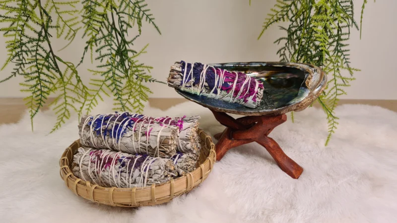 Zorg voor een vuurvaste schaal of een abaloneschelp en een zakje zand. Steek het uiteinde van de bundel aan en wapper er even mee zodat het vlammetje dooft en de bundel blijft smeulen.