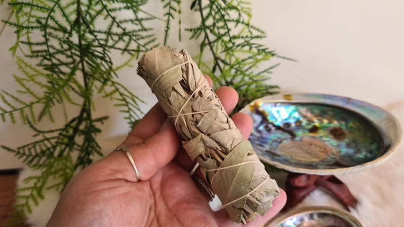 Een smeulbundel van deze Witte Salie & Eucalyptus is dus erg populair voor het bewieroken van iemands aura (van boven naar beneden) of het energetisch zuiveren van kamers. Zorg dat je ten alle tijden goed ventileert.
