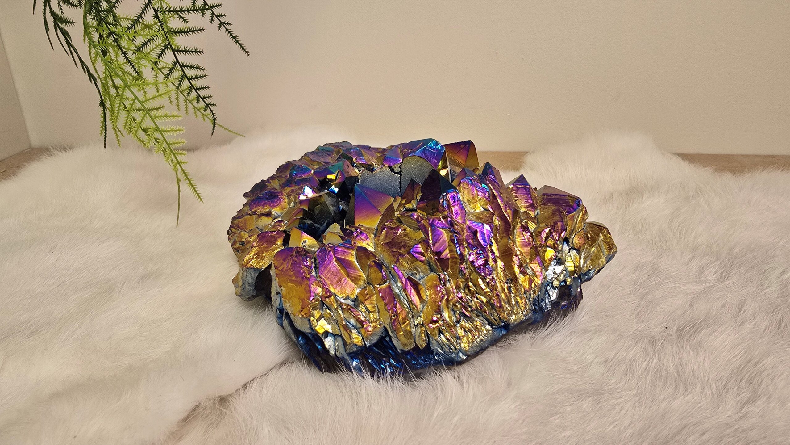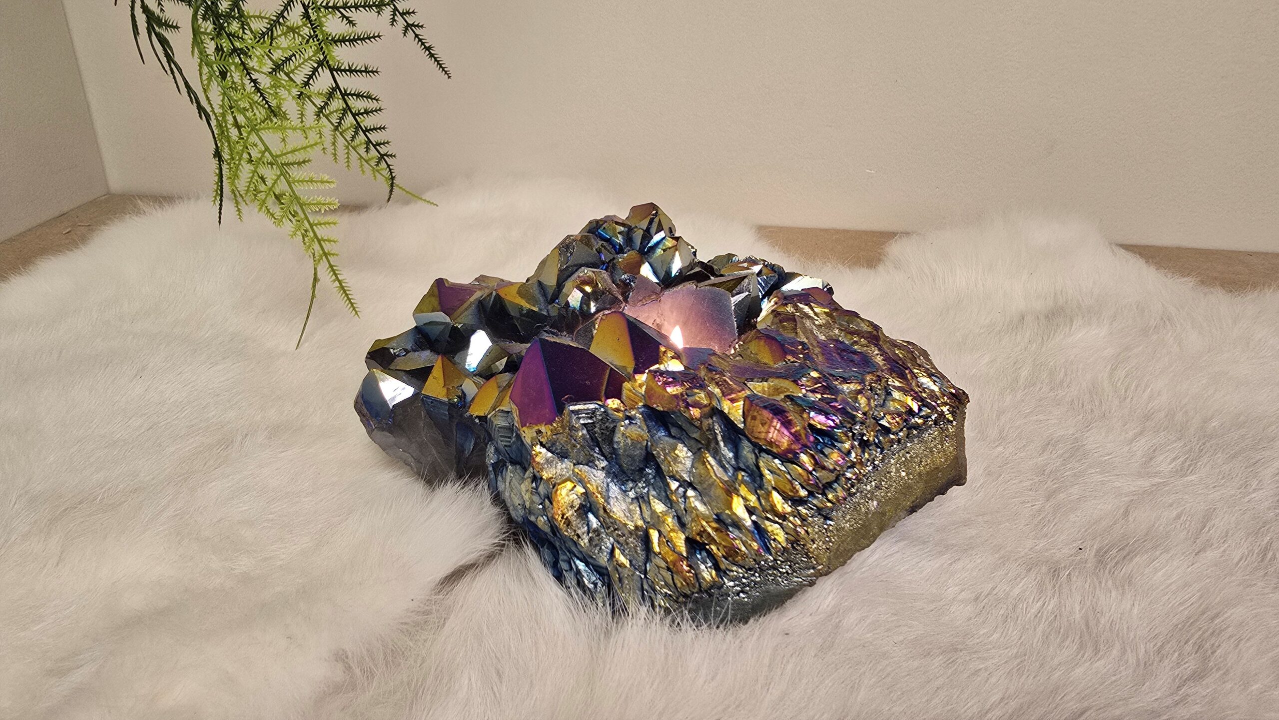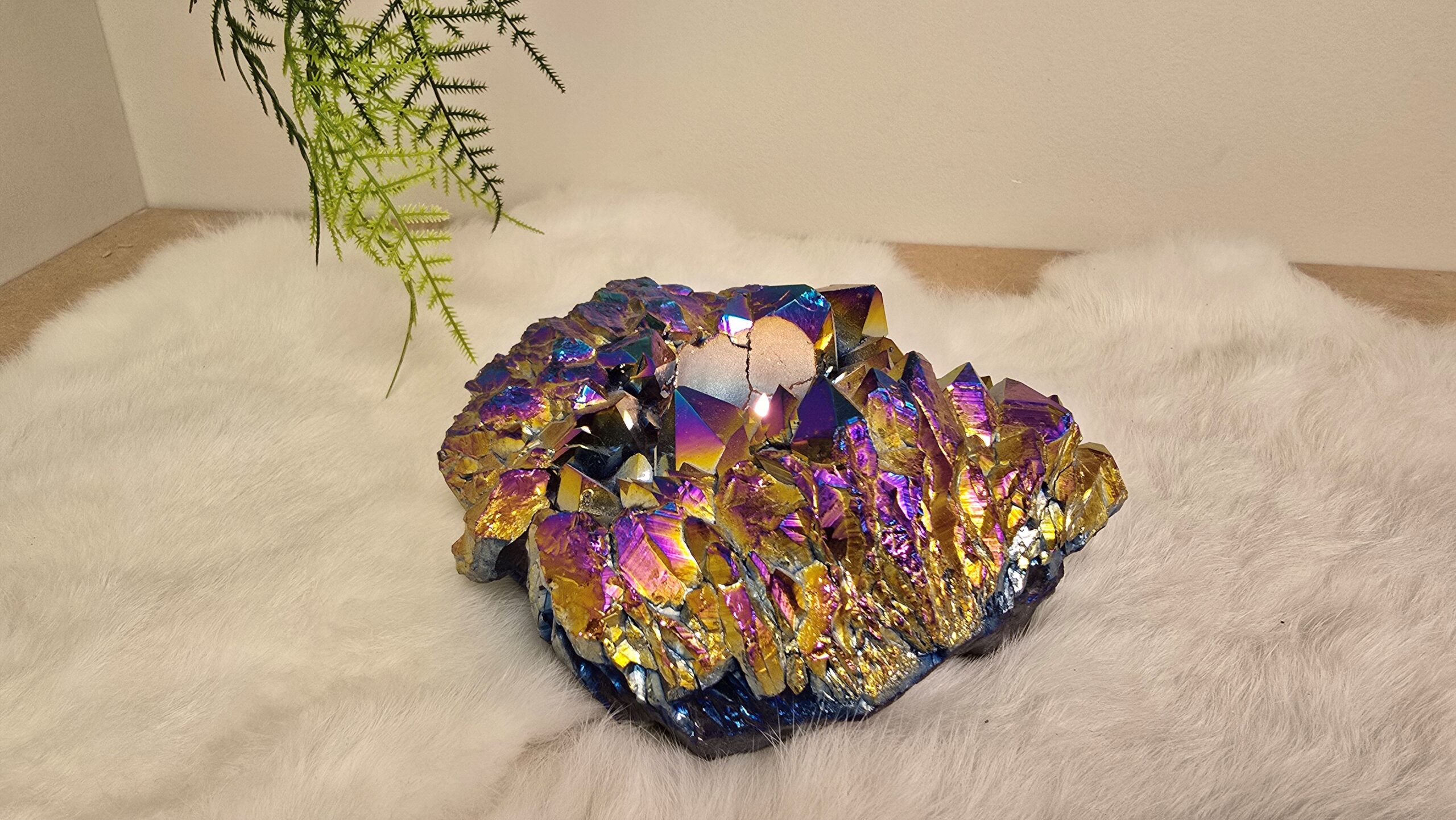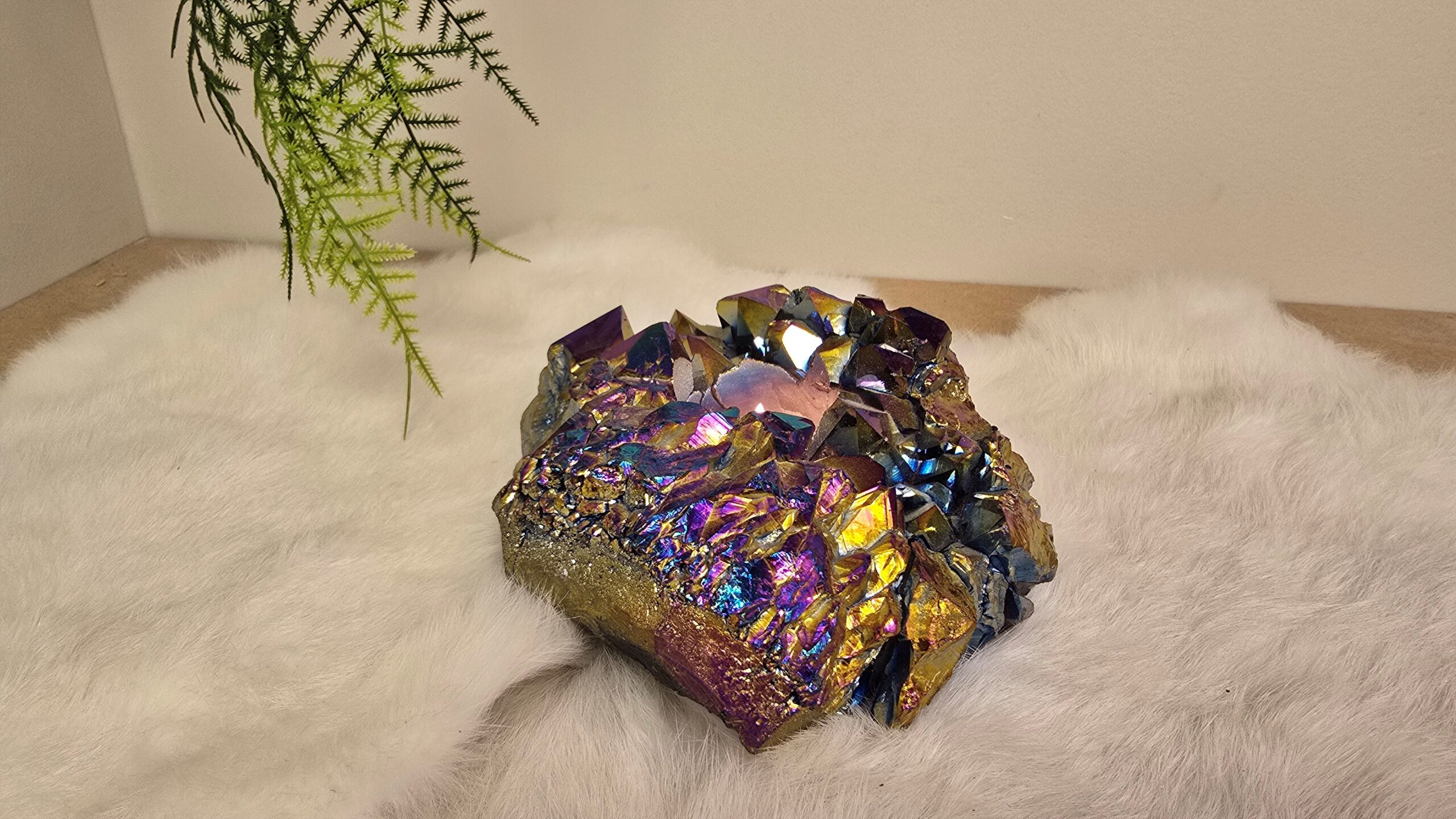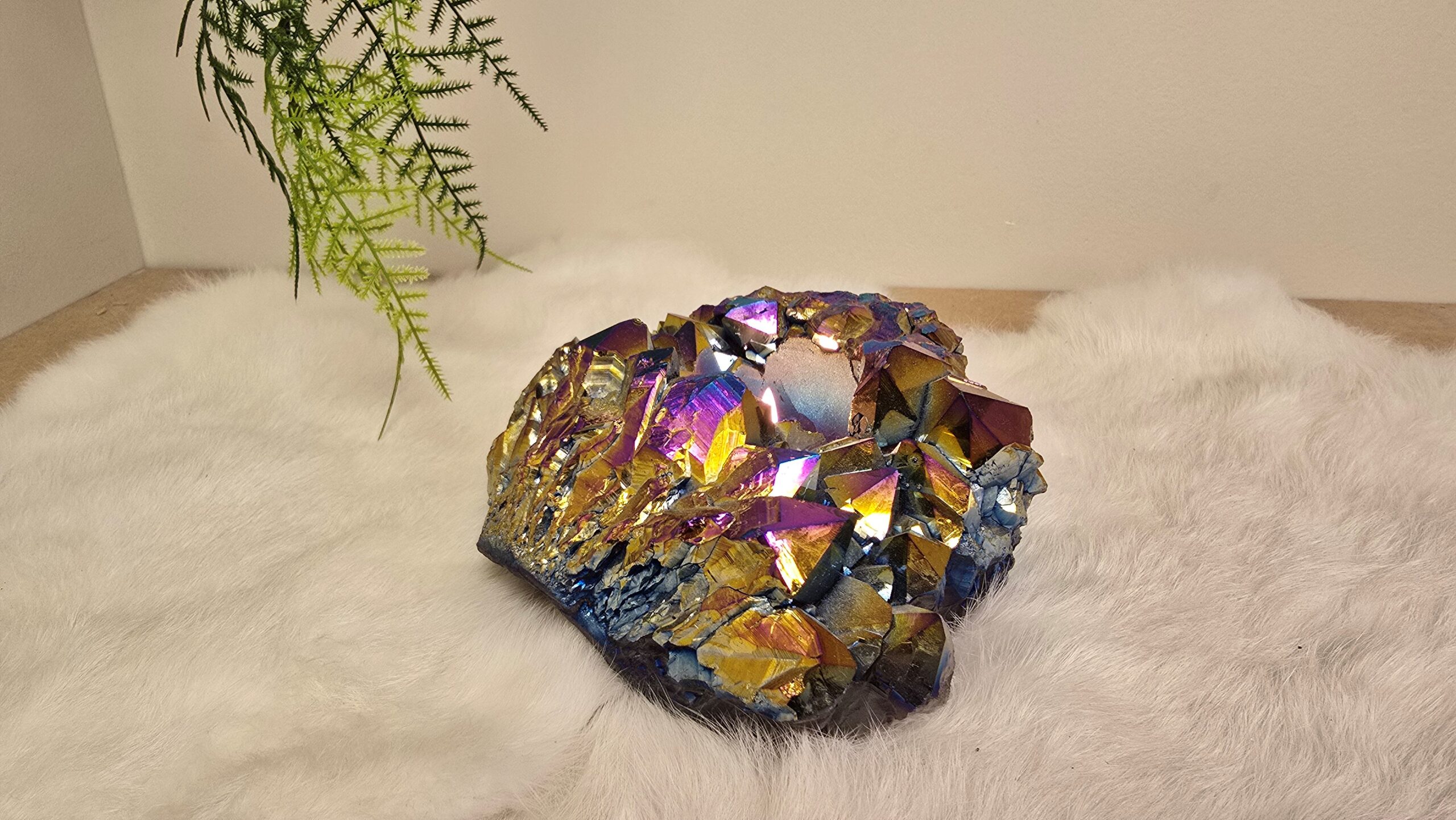Titanium Aura met zijn iriserende uiterlijk is een meester aarding en een balancerende steen. Het wordt vaak gebruikt om positieve, heldere energie te verzamelen, negatieve energie los te laten, waardoor het je helpt te bevrijden van het vastzitten in omstandigheden. Het beschermt ons en lost lage energietrillingen op. Titanium Aura verbetert ons vermogen om grenzen te stellen en stevig in onze beslissingen te staan. Tevens beschermt het ons ook tegen elektromagnetische velden.