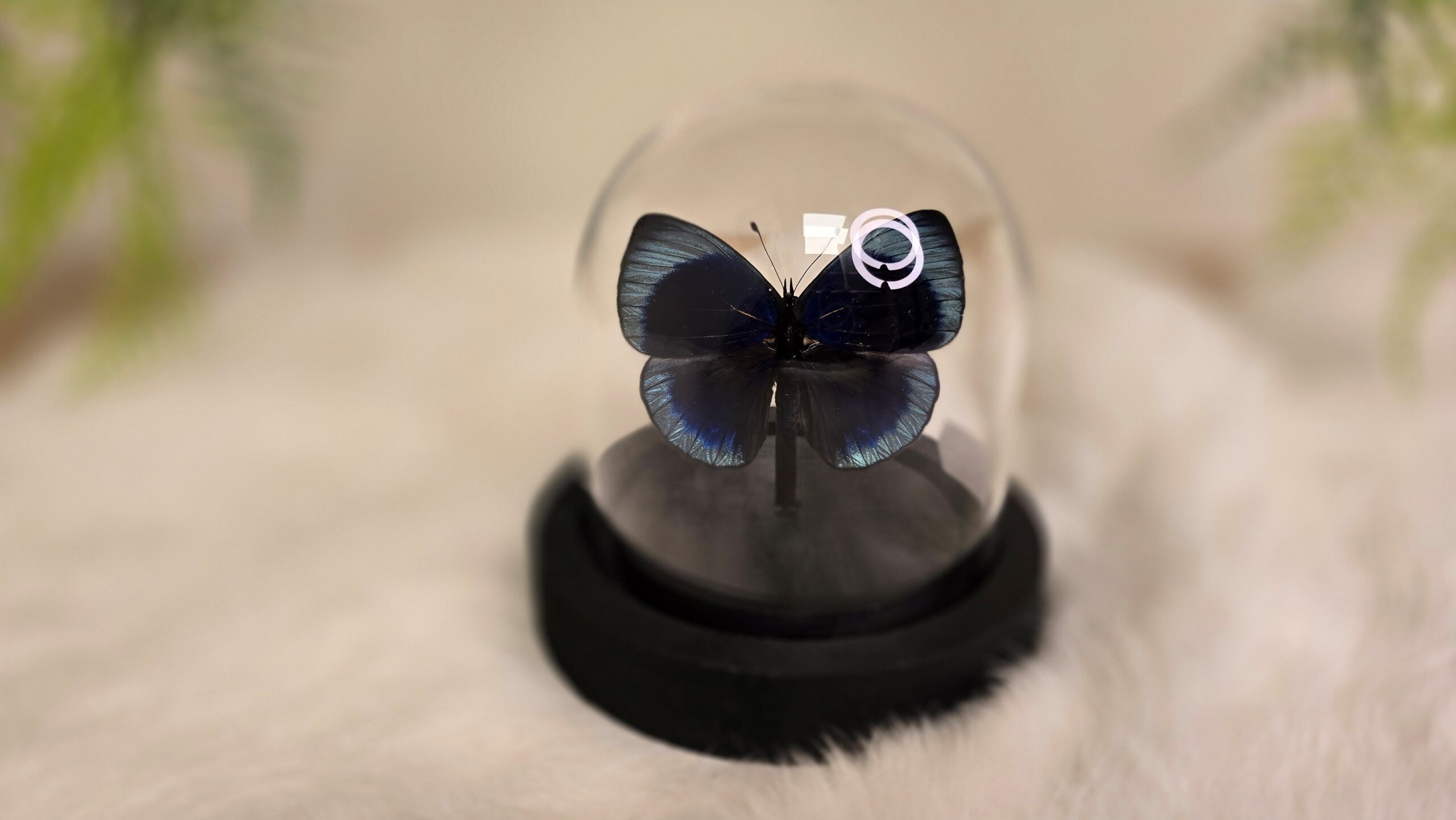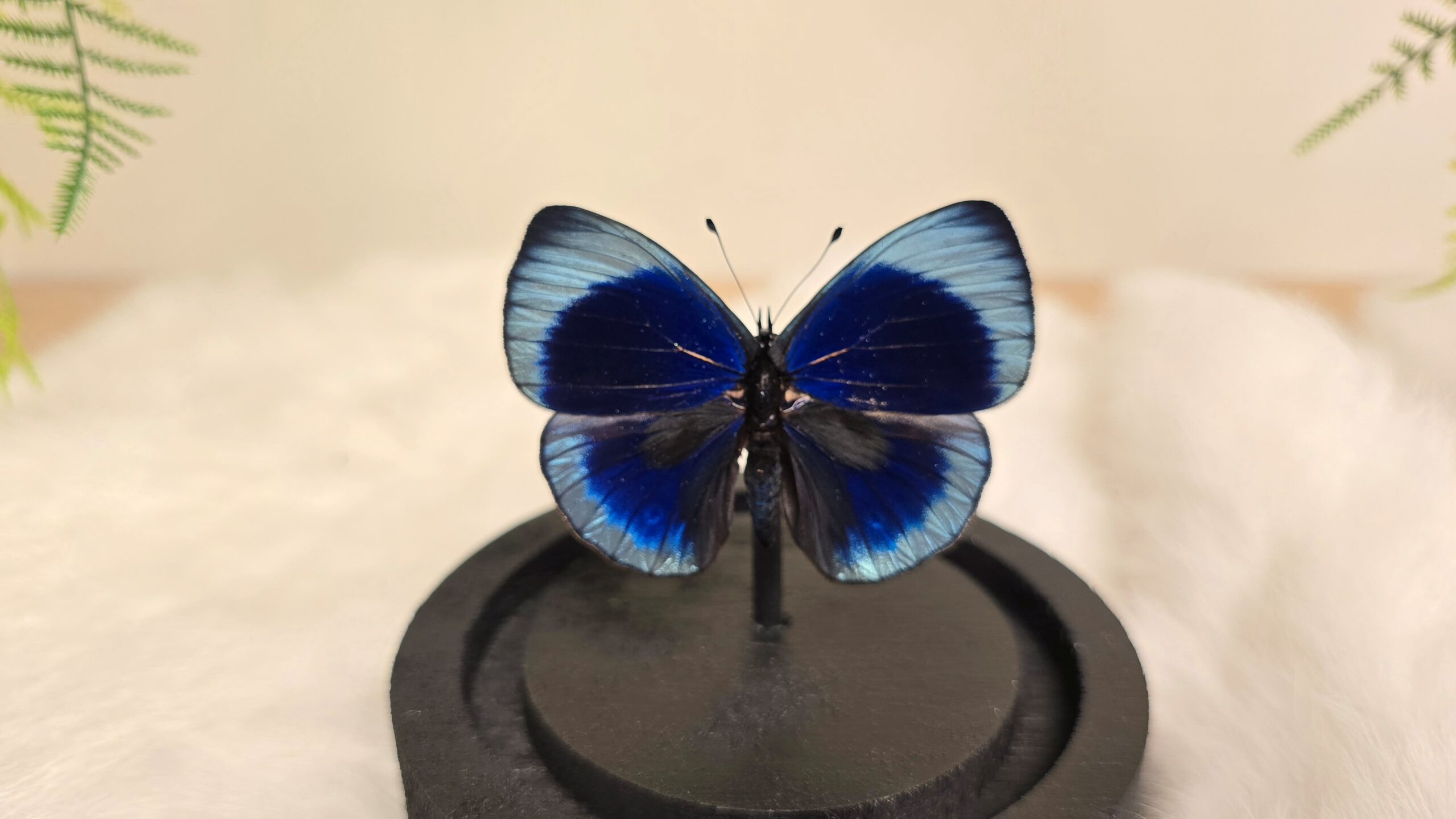 Een stolp, zwarte voet met daarin een blauwe opgezette vlinder verwerkt: Asterope Leprieuri