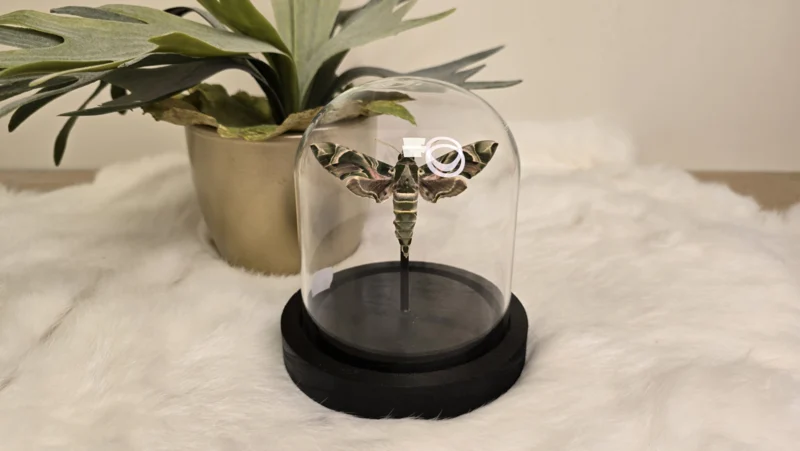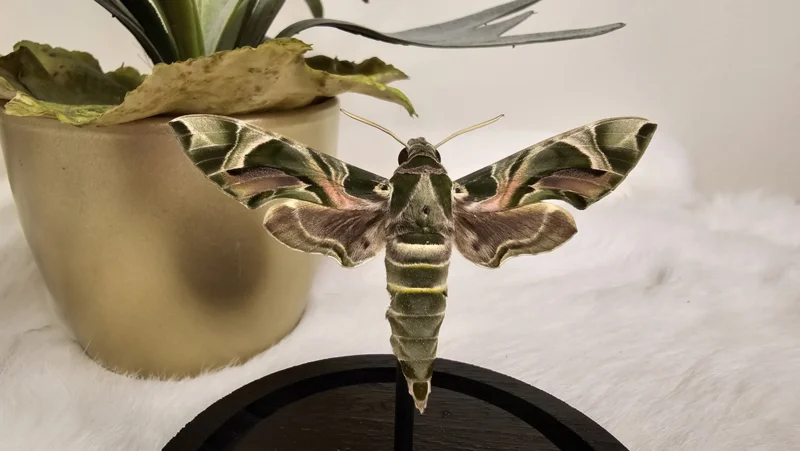 Een stolp, zwarte voet met daarin een roze, groen opgezette vlinder/ mot verwerkt: Daphnis Nerii, ook wel bekend als de Oleanderpijlstaart