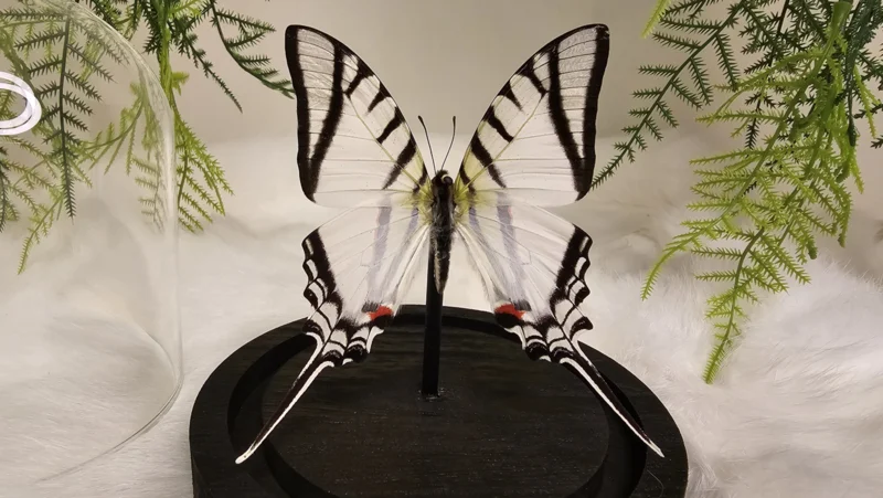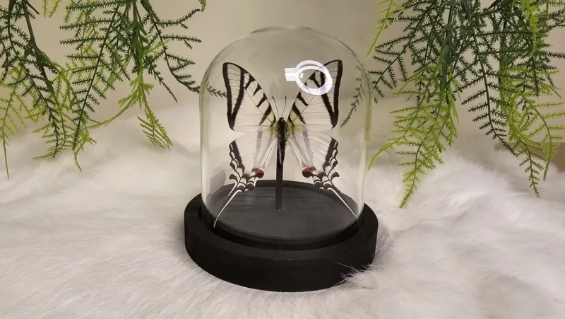 Een stolp, zwarte voet met daarin een zwart, witte opgezette vlinder verwerkt: Eurytides Protesilaus