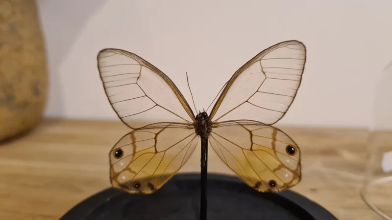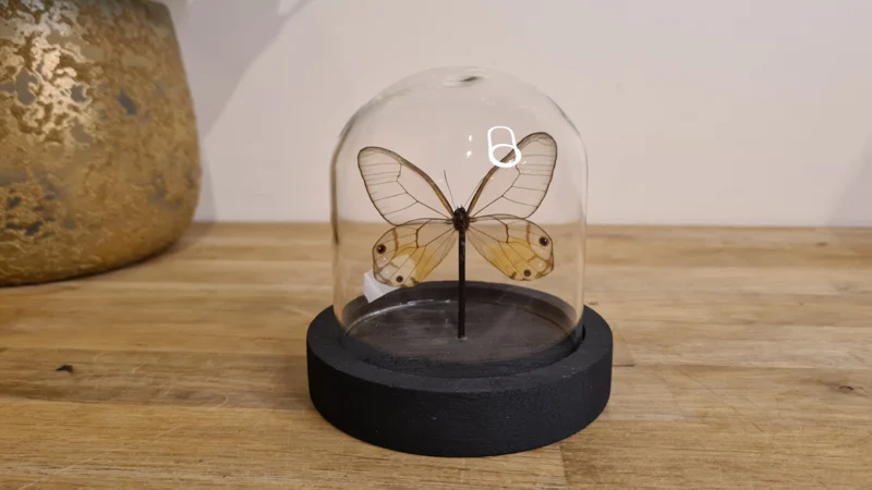 Een stolp met zwarte voet, met daarin een gele, transparante opgezette vlinder: Haetera Piera, ook bekend als glasvlinder.