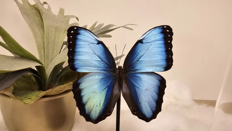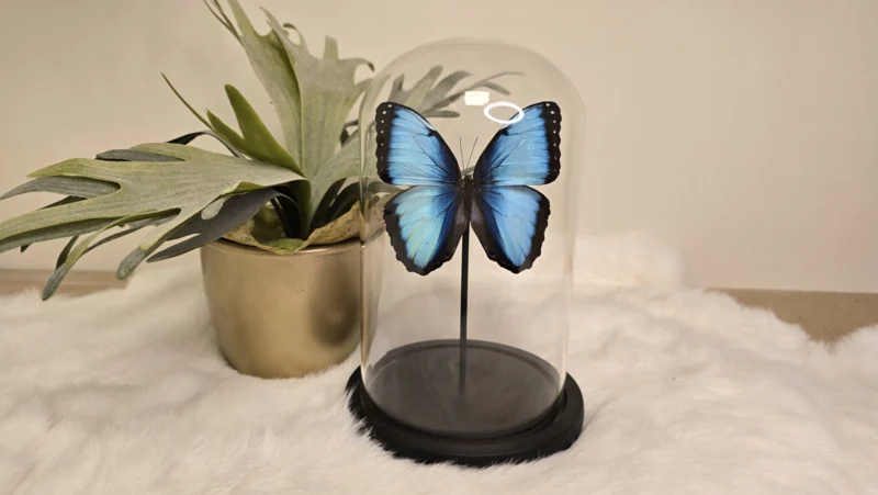Een stolp, zwarte voet met daarin een felblauwe opgezette vlinder verwerkt: Morpho Peleides Carillensis
