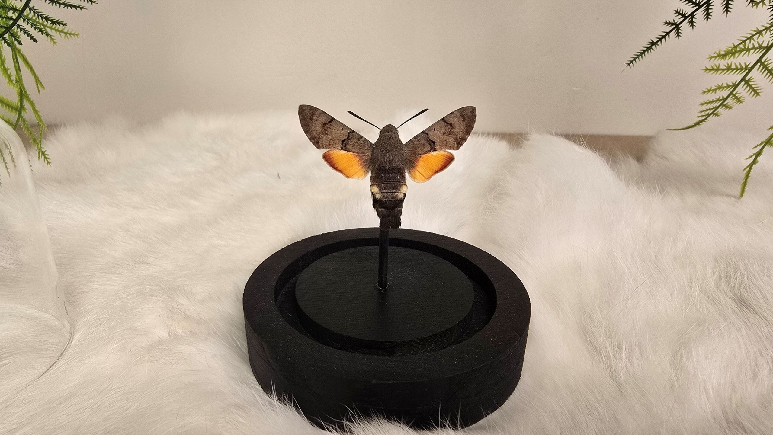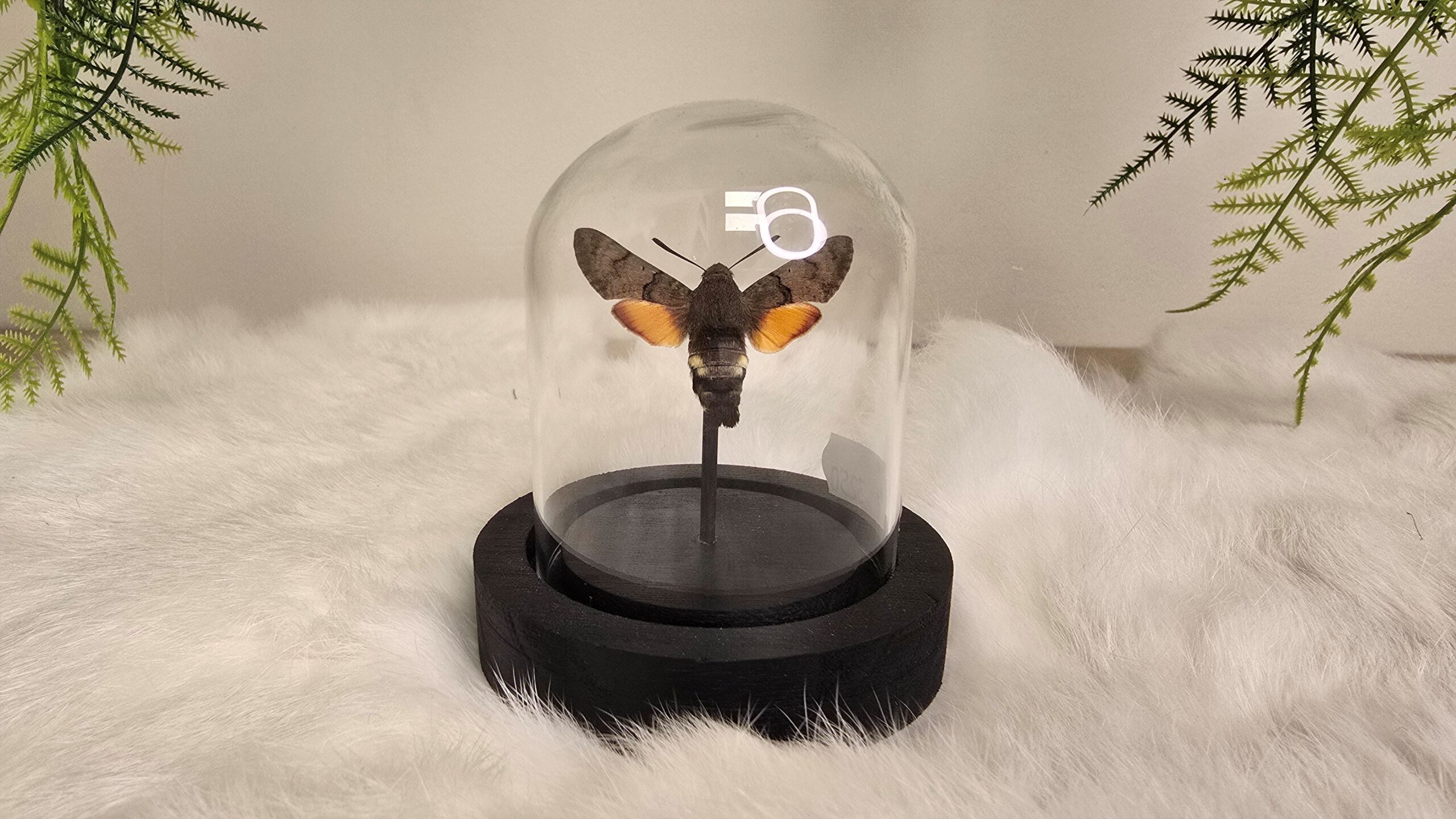 Een stolp, zwarte voet met daarin een bijzondere oranje, bruine opgezette vlinder/ mot verwerkt: Macroglossum Stellatarum, ook wel genaamd de Kolibrievlinder