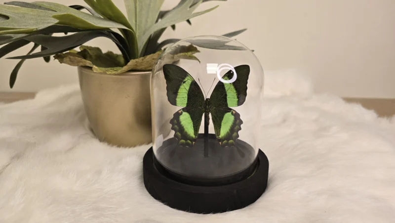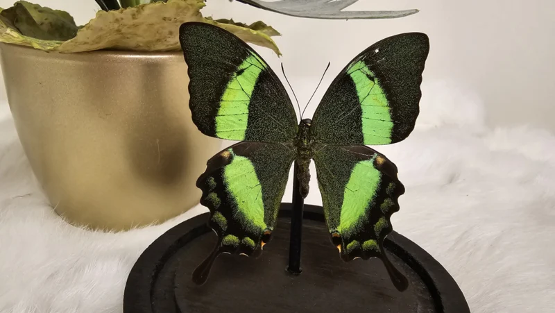 Een stolp, zwarte voet met daarin een zwart, groene opgezette vlinder verwerkt: Papilio Palinurus