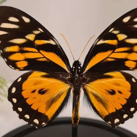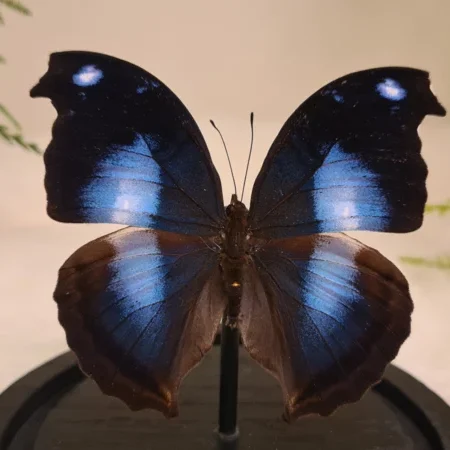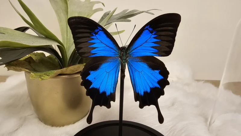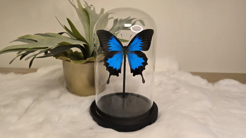 Een stolp, zwarte voet met daarin een fel blauwe opgezette vlinder verwerkt: Papilio Ulysses
