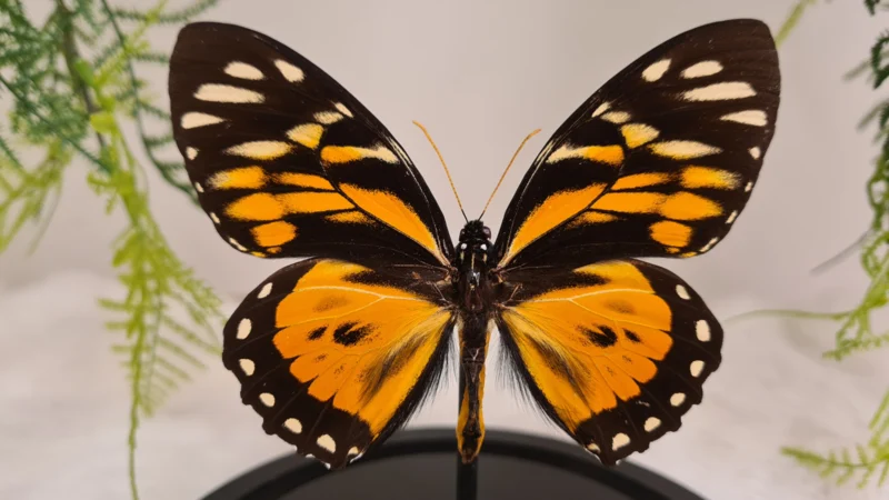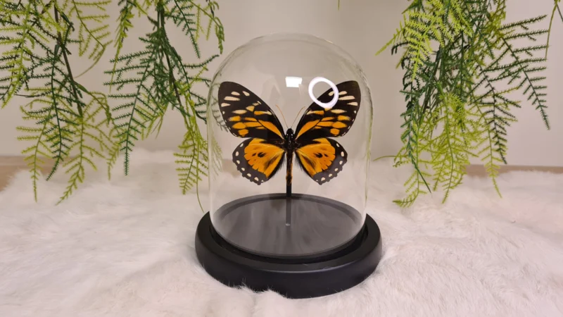Een stolp met zwarte voet, gevuld met een bijzondere oranje opgezette vlinder: Papilio Zagreus.