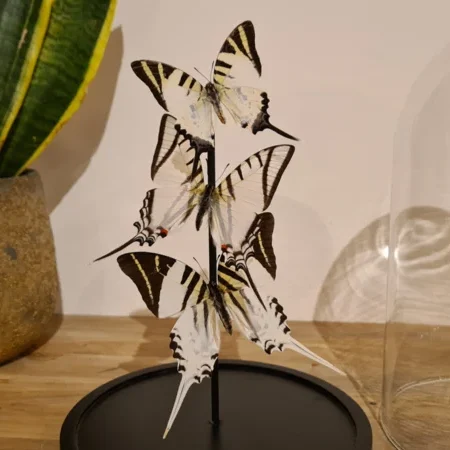 Een vierkante glazen vitrine box/ display stolp met zwarte randen en voet met daarin een 4 verschillende wit, zwart, naturel opgezette vlinders verwerkt: