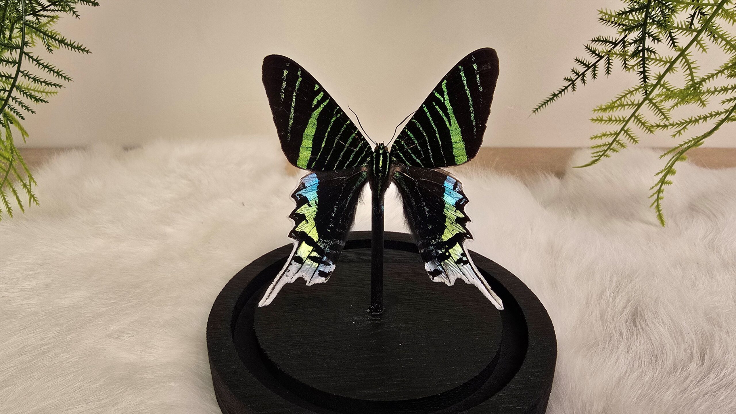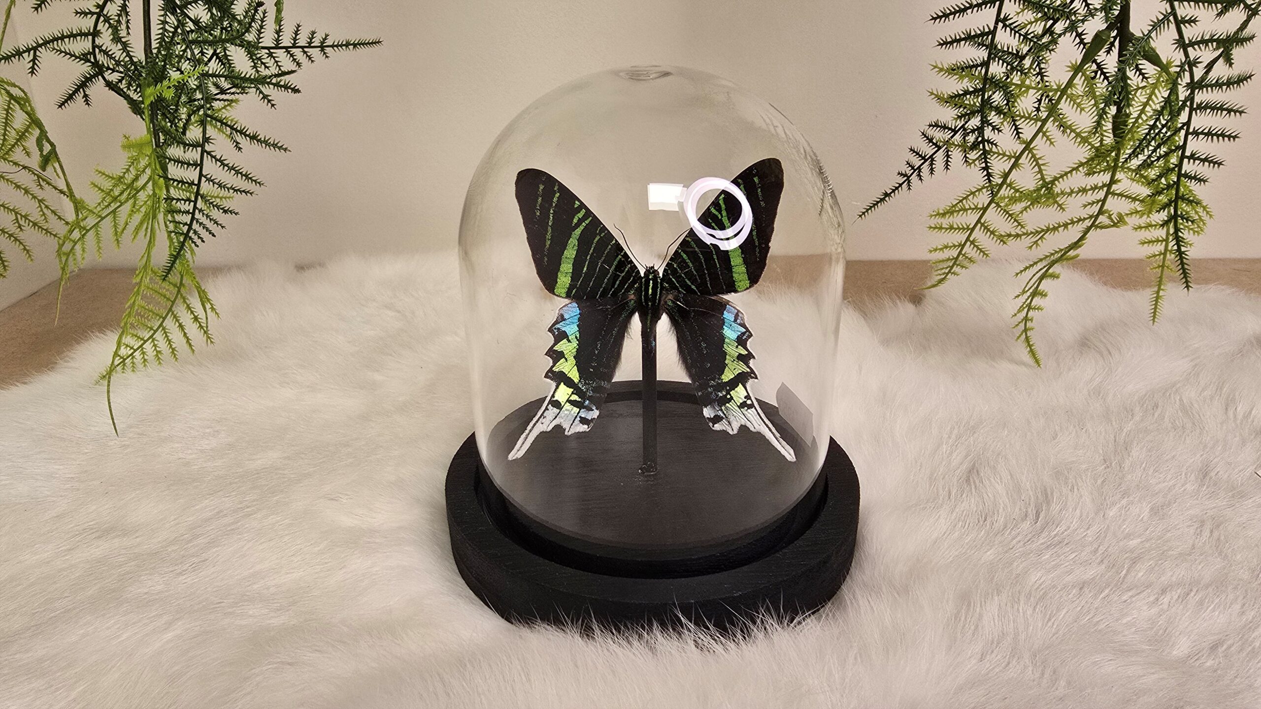 Een stolp, zwarte voet met daarin een blauw, groen, zwarte opgezette vlinder/mot verwerkt: Urunia Leilus
